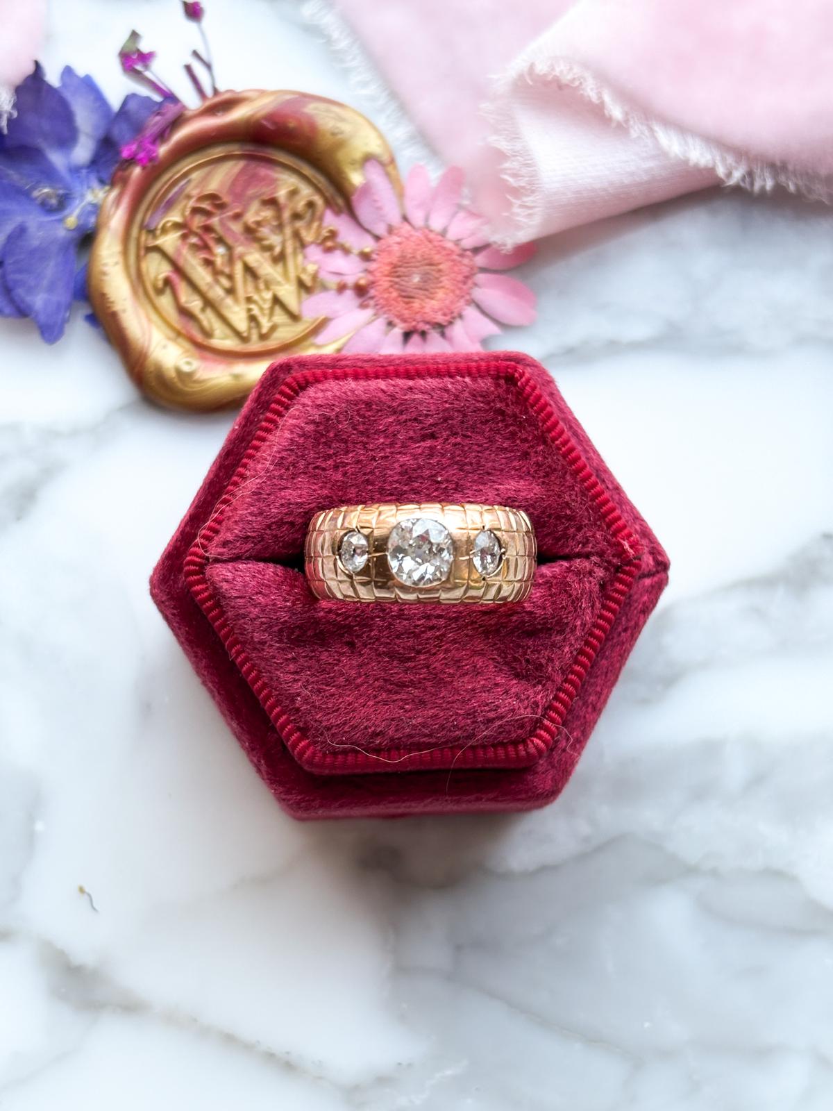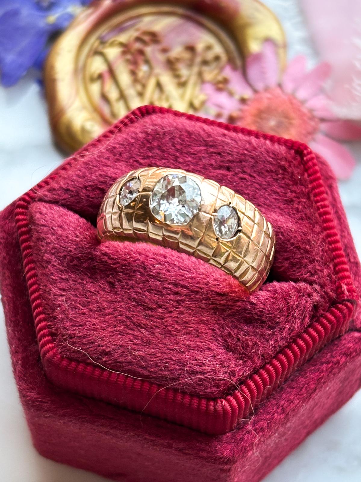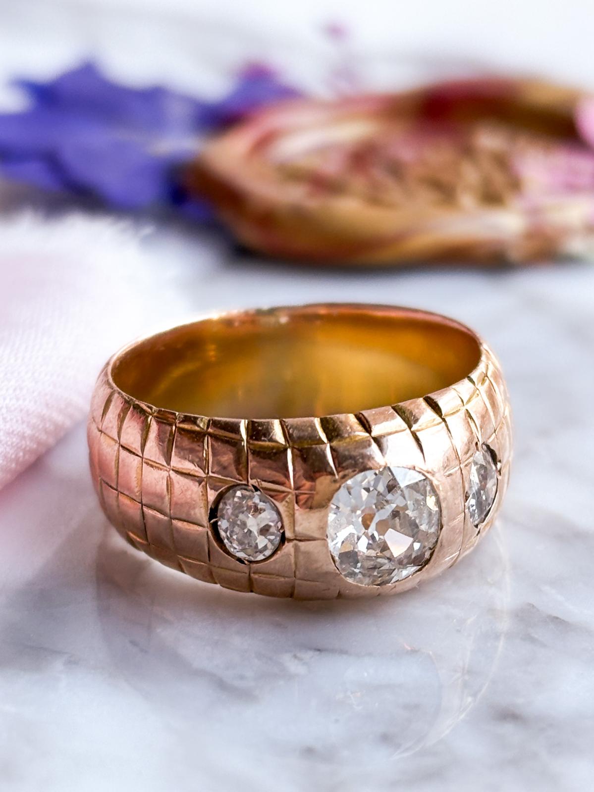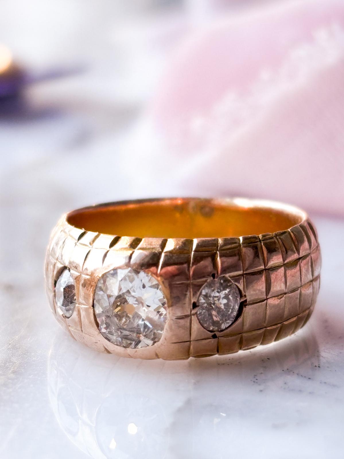 Description: An antique Russian band in 14k rose gold, stamped 56, dating to the late 19th or early 20th century. The wide, hand-finished band features three original bezel-set old mine cut diamonds. The center stone is a cushion-cut old mine, approximately 0.75 ct, flanked by two old mine cuts of approximately 0.30 ct each, for an estimated 1.35 ctw total. The band displays a deeply chased, geometric surface consistent with Russian workmanship of the period.