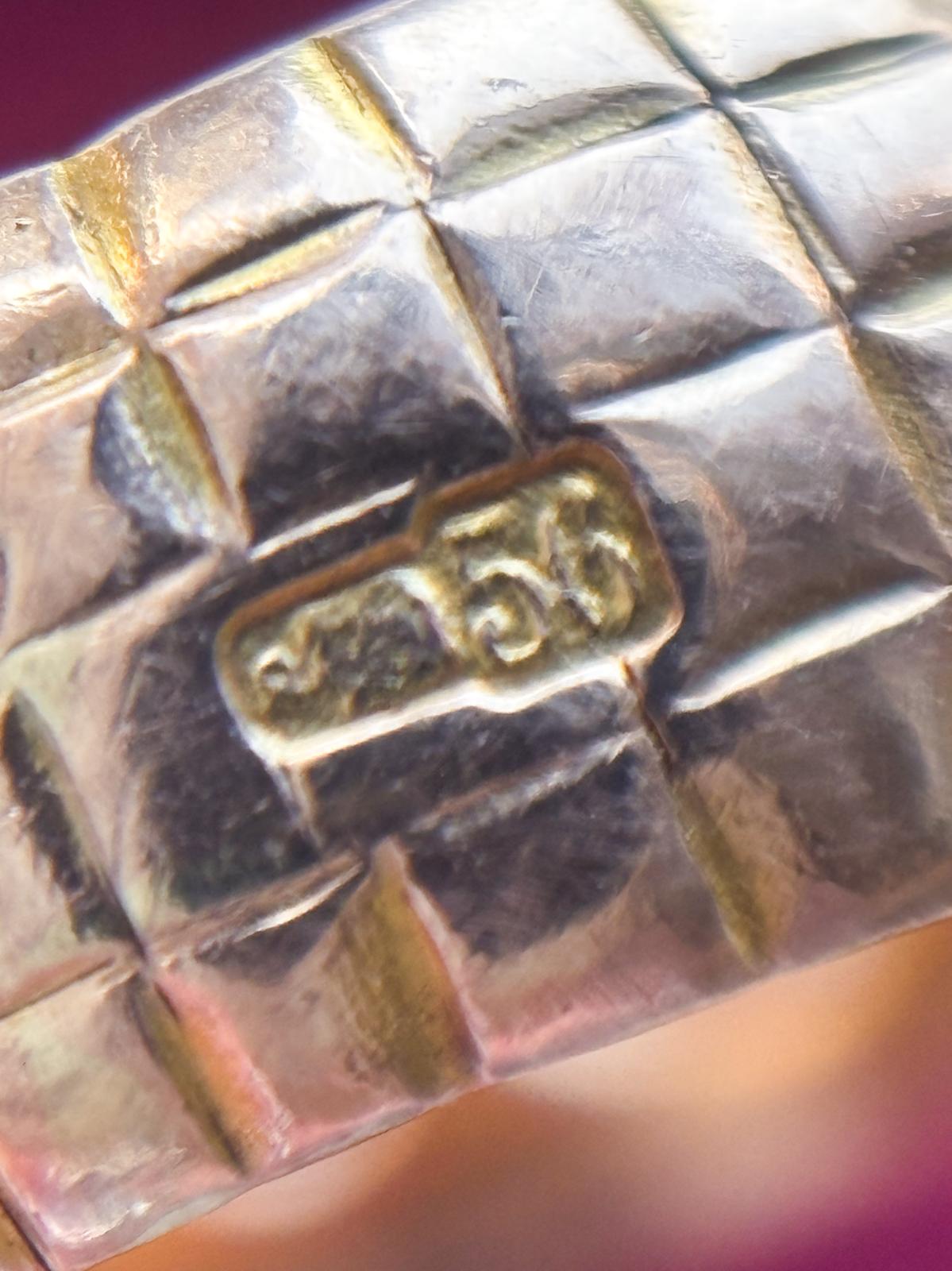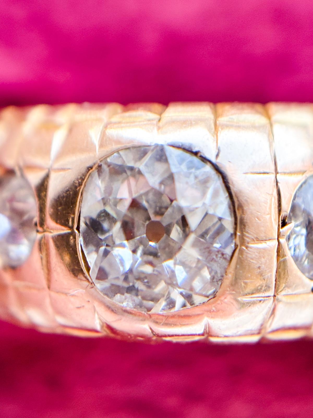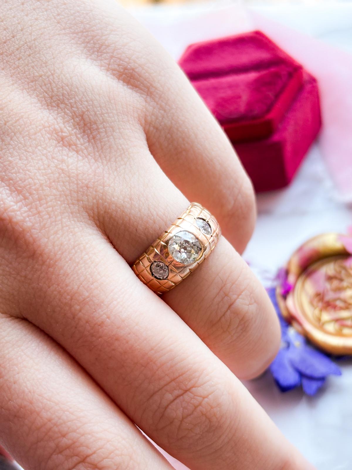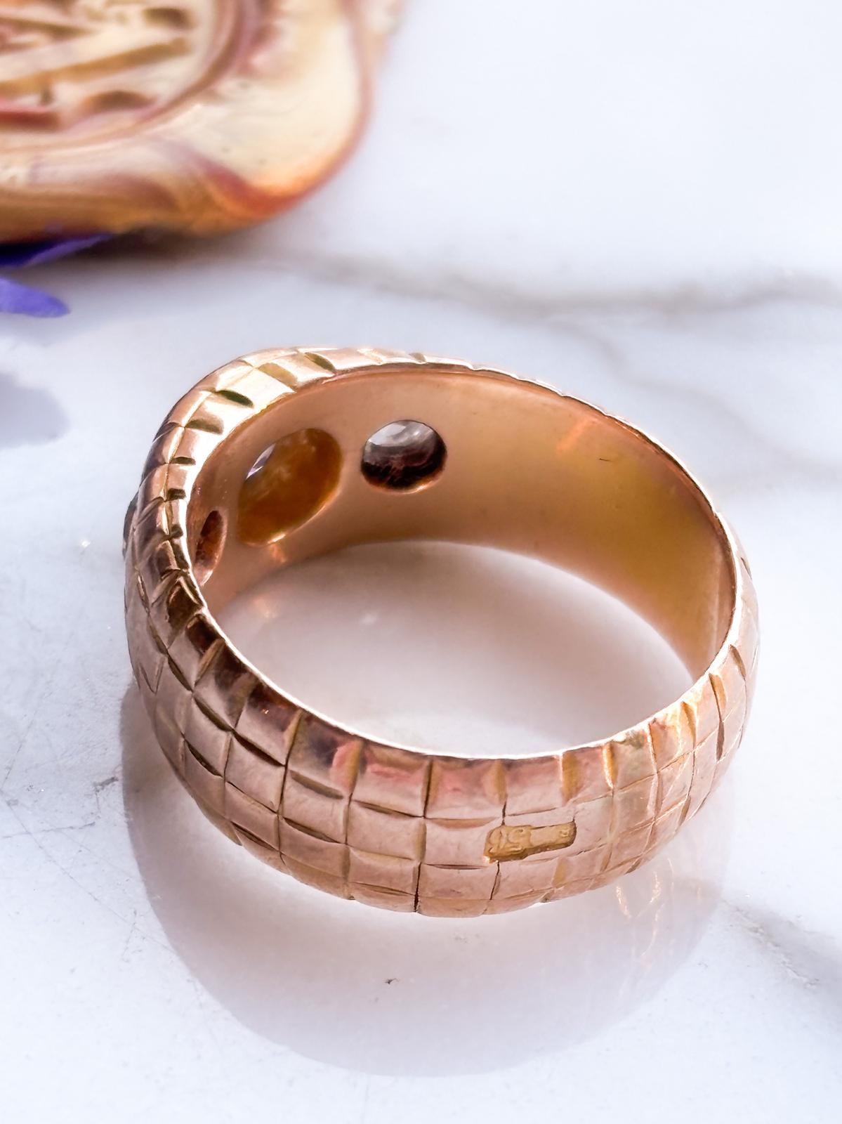 Description: An antique Russian band in 14k rose gold, stamped 56, dating to the late 19th or early 20th century. The wide, hand-finished band features three original bezel-set old mine cut diamonds. The center stone is a cushion-cut old mine, approximately 0.75 ct, flanked by two old mine cuts of approximately 0.30 ct each, for an estimated 1.35 ctw total. The band displays a deeply chased, geometric surface consistent with Russian workmanship of the period.