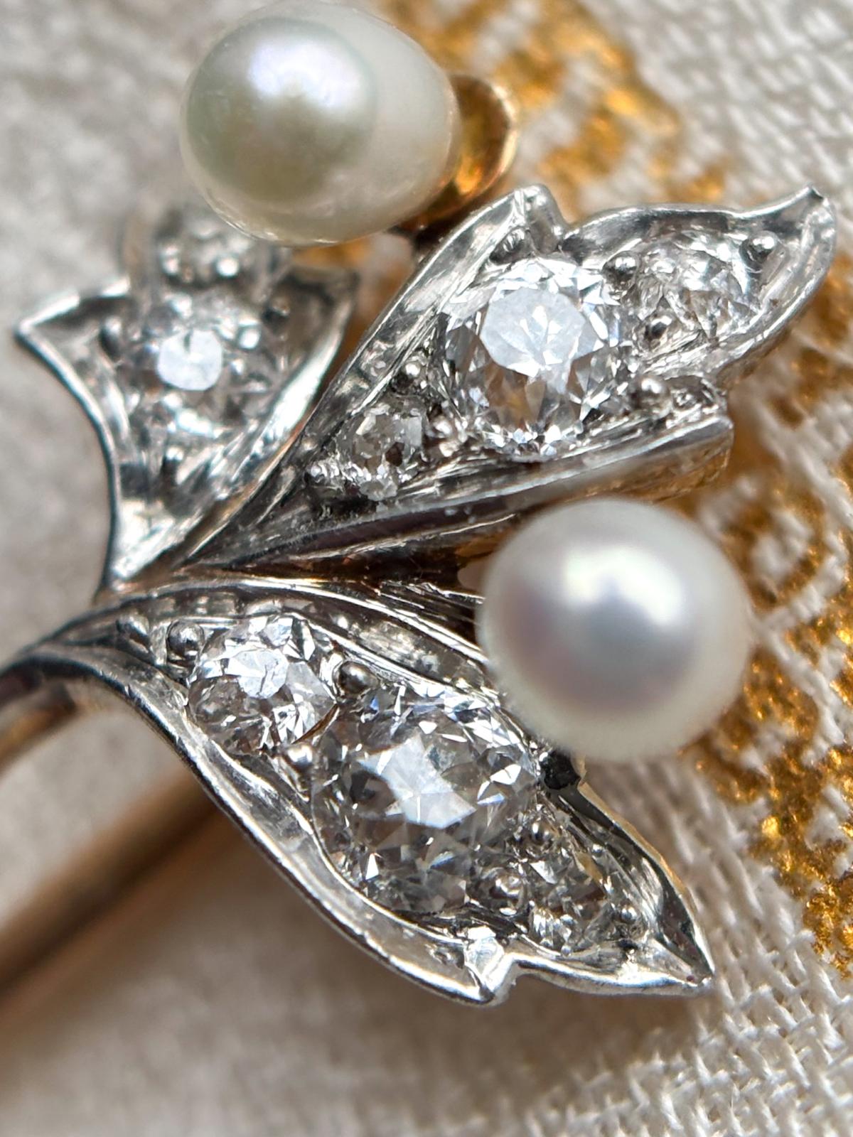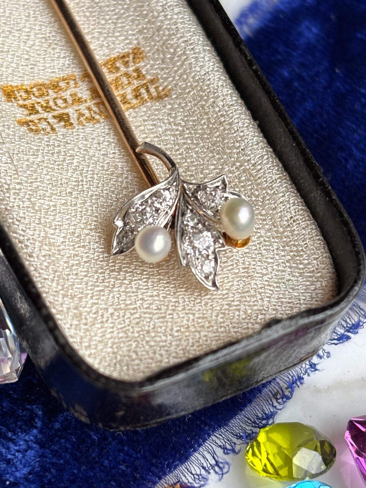 Description: This beauty is an antique platinum topped and 14k tested stickpin attributed to Tiffany & Co. and offered with its original Tiffany & Co. fitted box and a screw-on safety clutch. Consistent with the period, many Tiffany stickpins were left unsigned, but I stand behind the authenticity of this piece. It features eight old mine–cut diamonds ~0.31cttw set in platinum with a 14k gold pin stem. Two seed pearls accent the floral head with a hand-engraved internal workshop number along the side of one leaf — a detail characteristic of Tiffany’s early 20th-century pieces.
