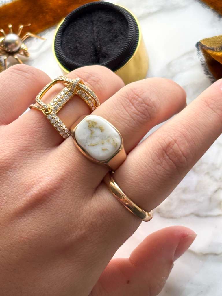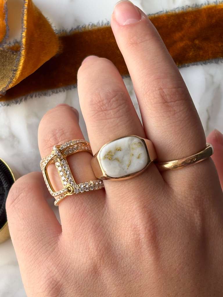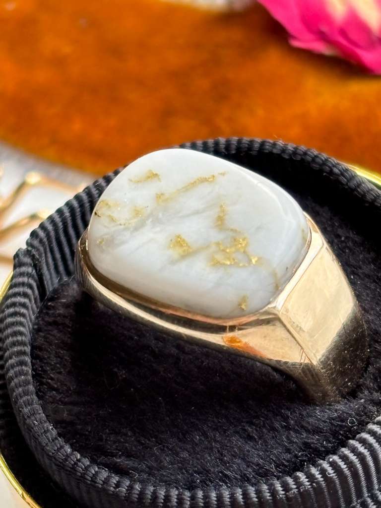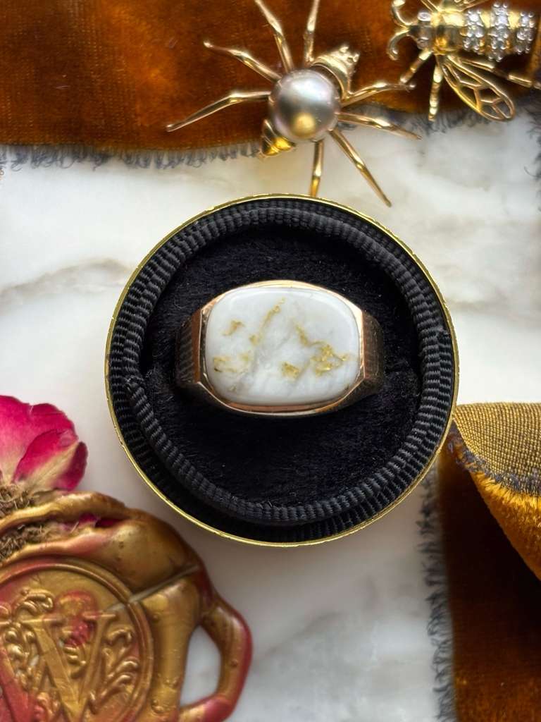 Description: Obsessed with gold bearing quartz ~ high grade gold veins, encased in various colored quartz, and found in just a handful of underground mines in the world. A vintage 14k tested (and faintly stamped) gold bearing quartz signet ring in yellow gold.