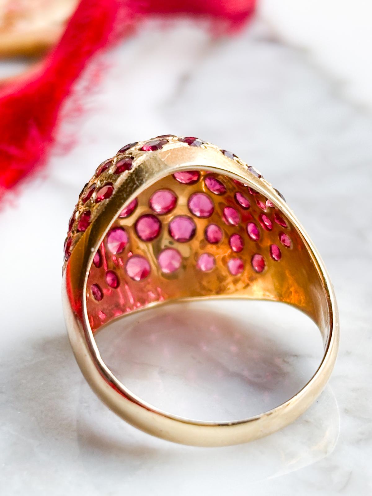 Description: A vintage 14k stamped natural ruby bombe ring in yellow gold.