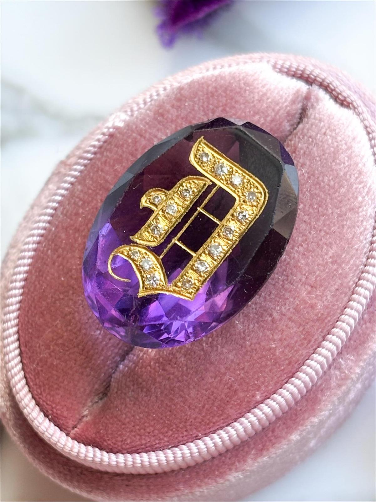 Description: An antique Victorian faceted 37.45ct natural amethyst with a gothic letter D, inlaid with 18k warm yellow gold and single-cut diamonds (untested to preserve the surface integrity). The inlay is executed using the refined piqué technique, where gold is pressed into shallow carvings on the gem’s surface to create a seamless, gleaming design.