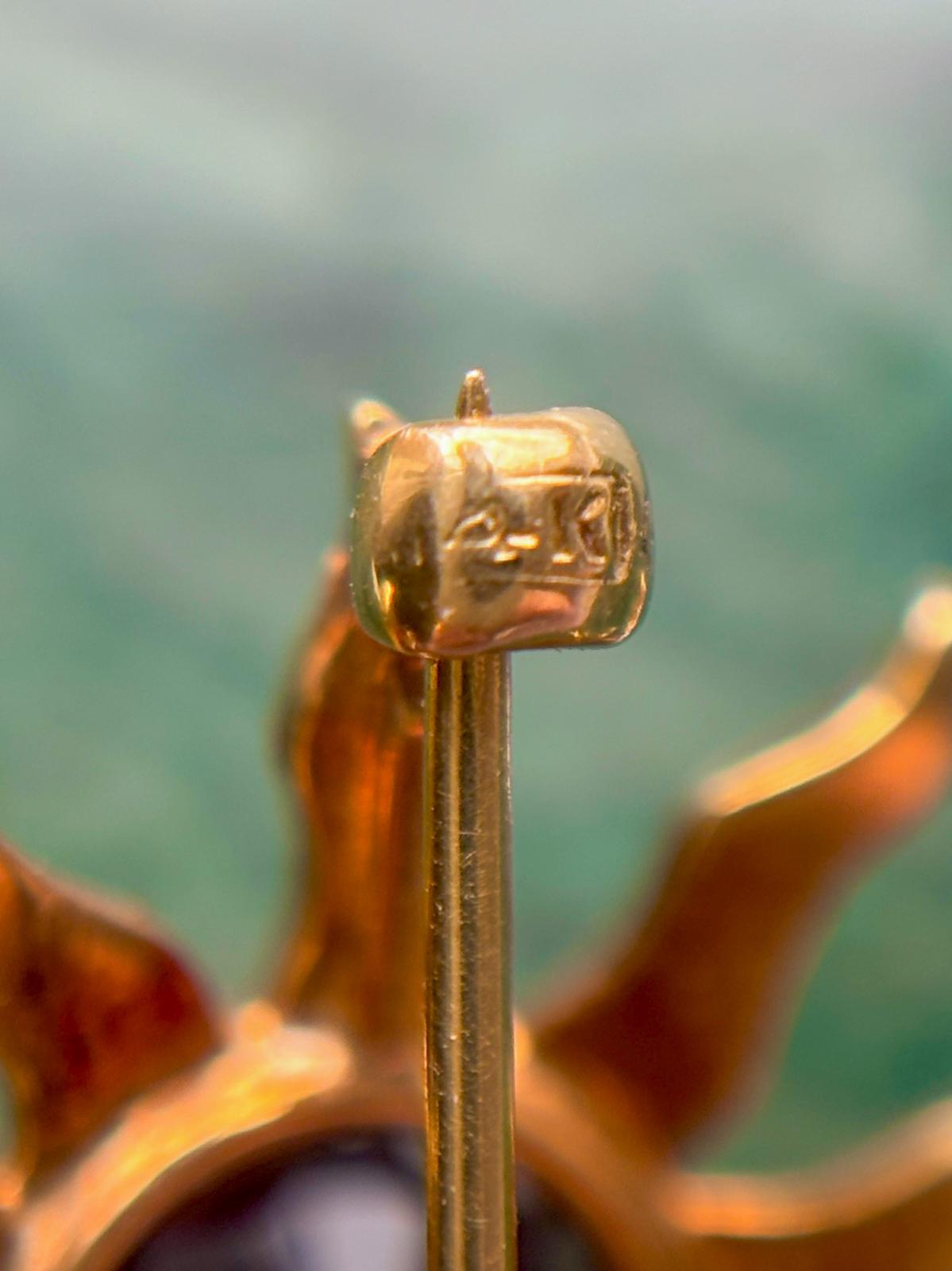 Description:  An Antique c1900, 14k stamped starburst brooch and pendant with hidden bail, amethyst center, and seed pearls.