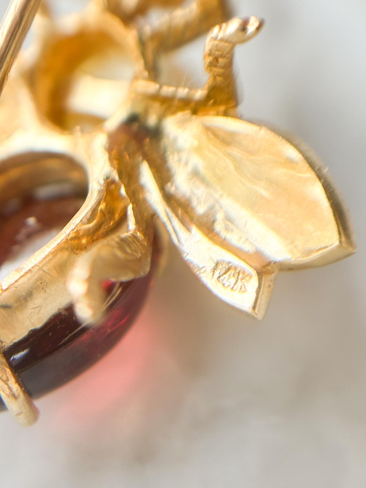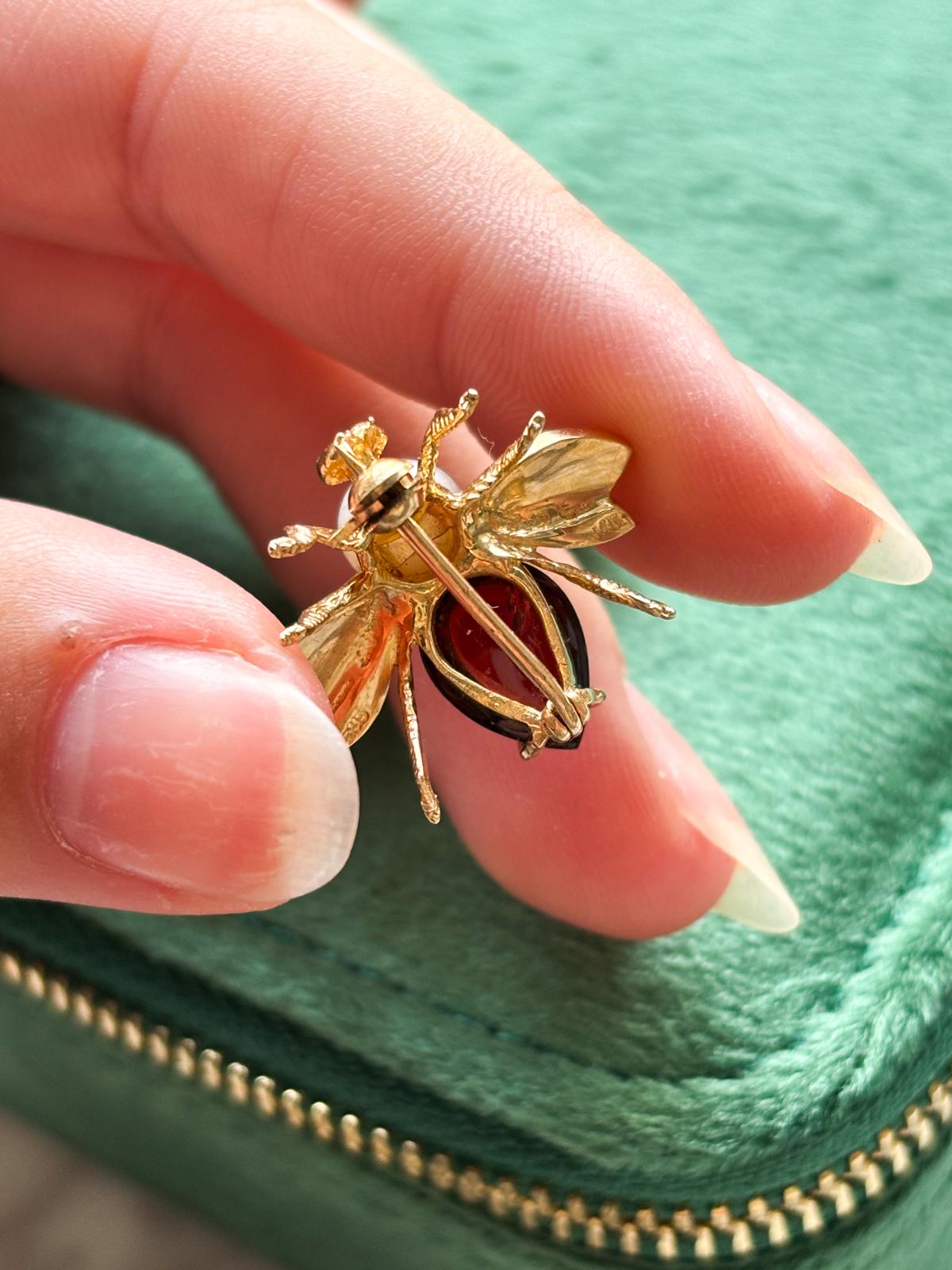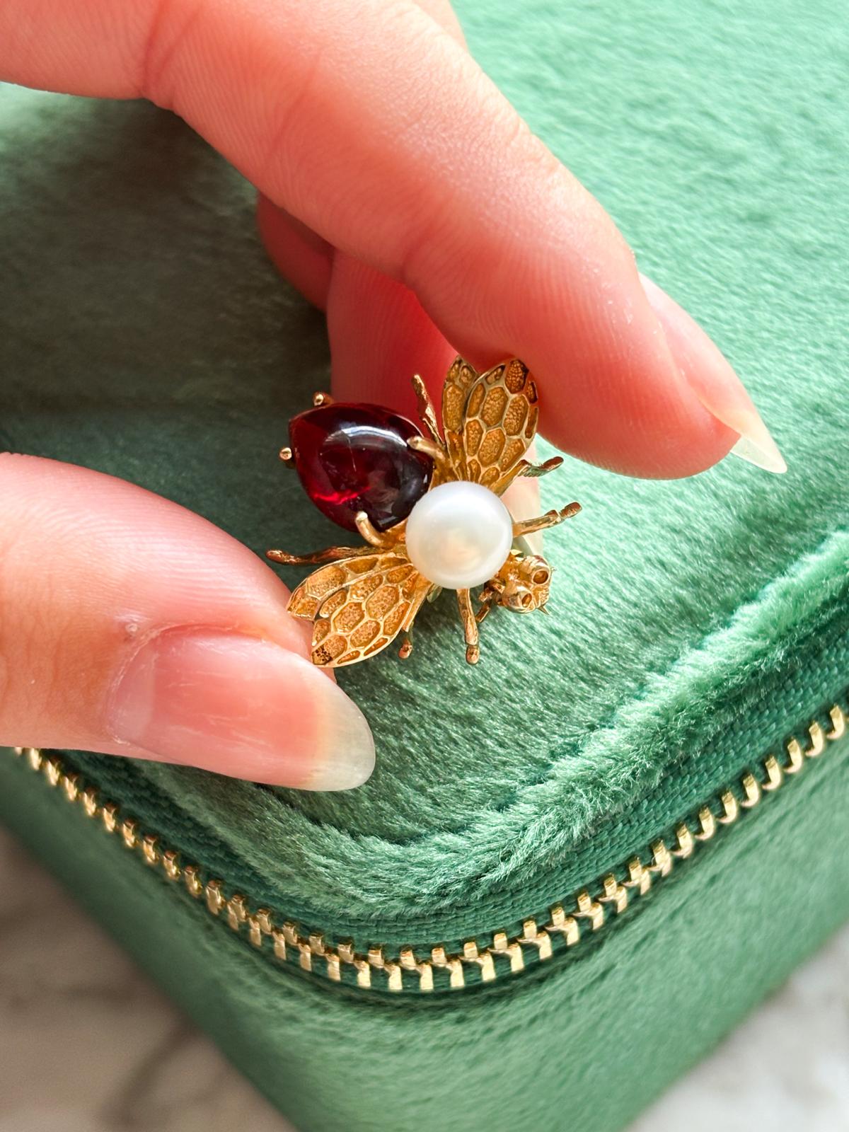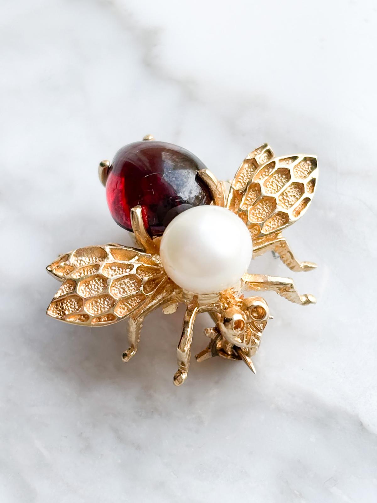 Description: This is a vintage 14k stamped garnet and pearl bee in yellow gold.