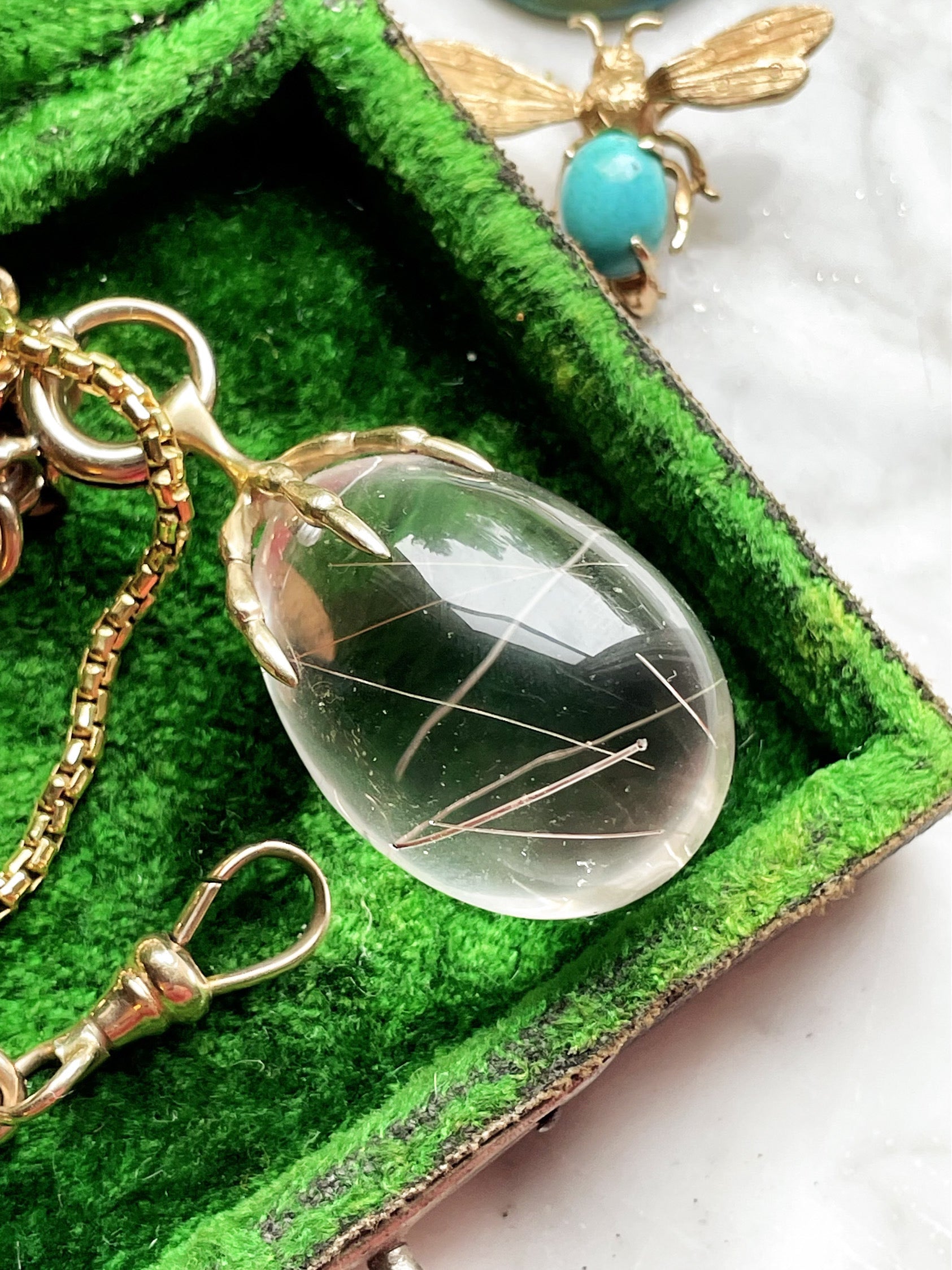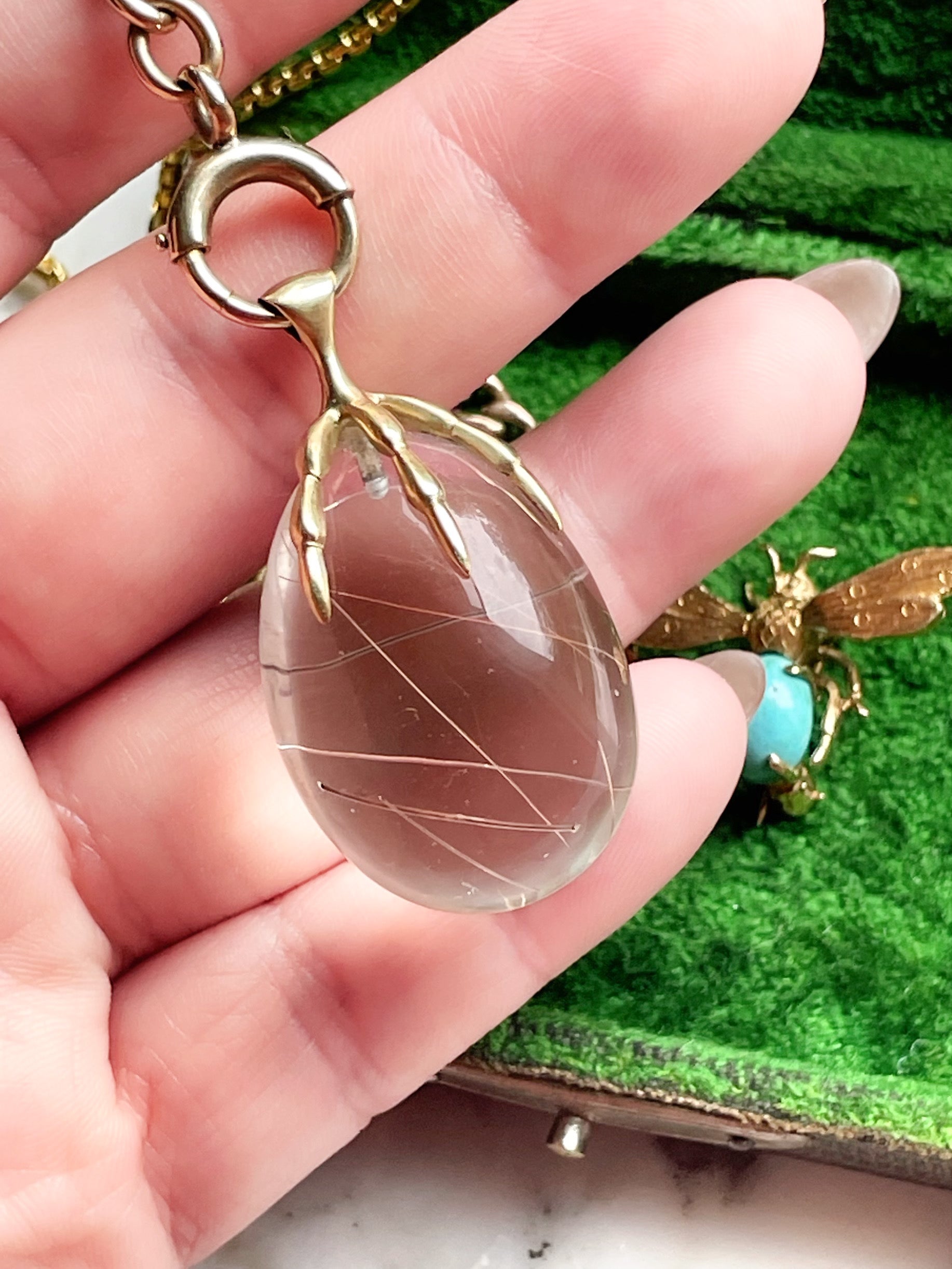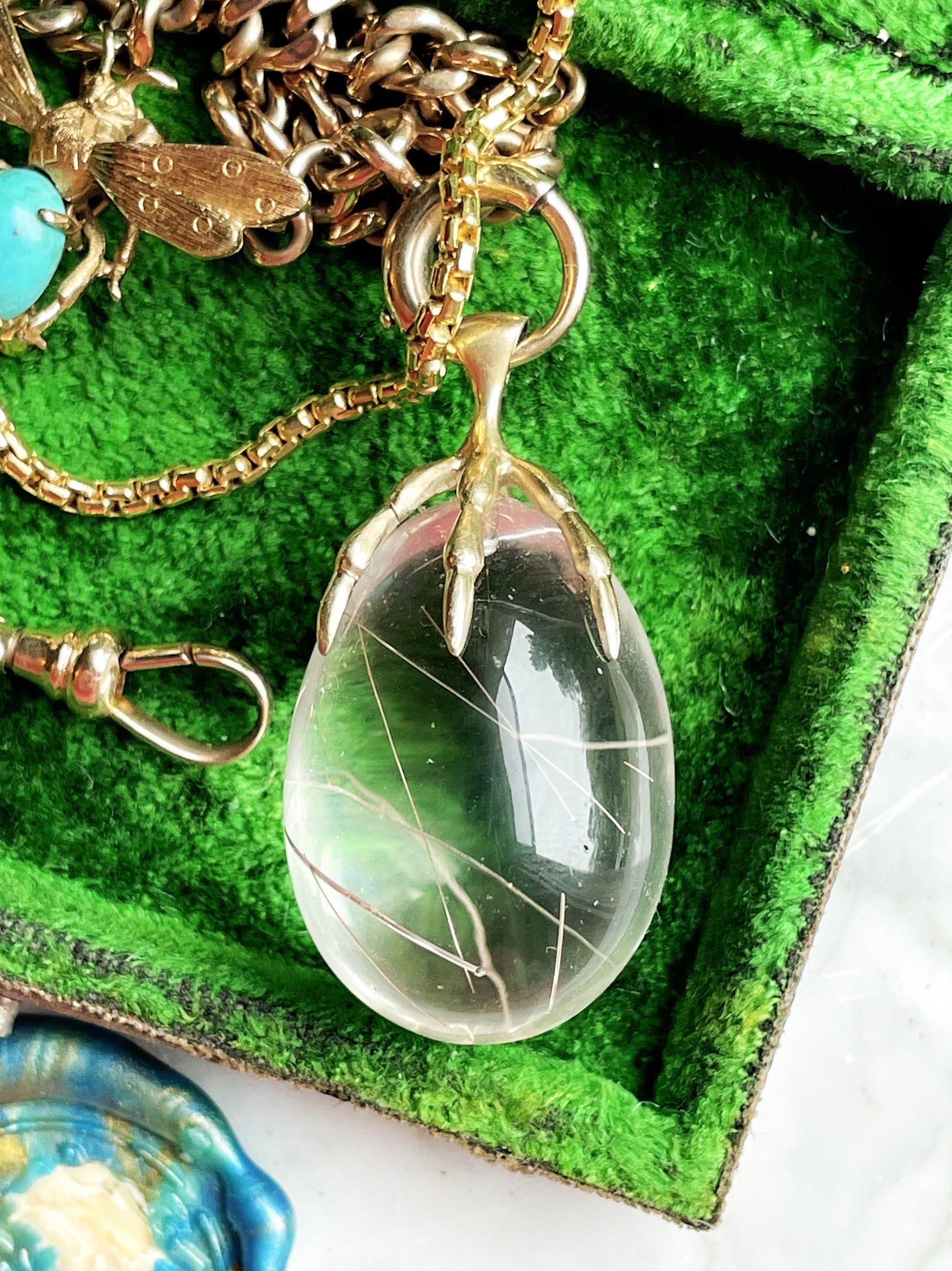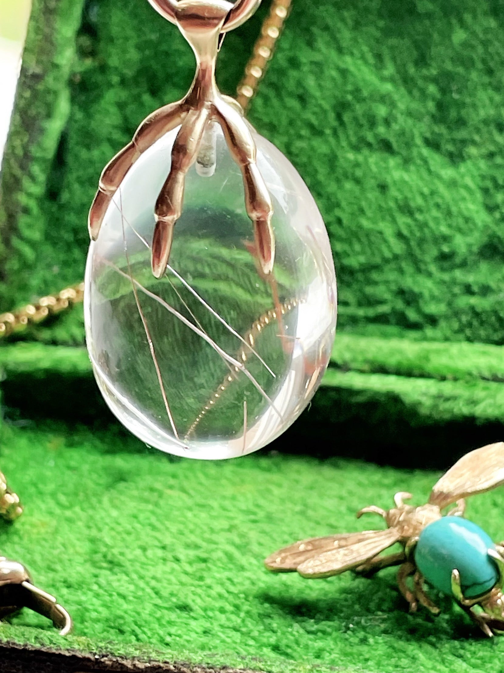 Description: A 10k tested rutile quartz egg captured by an avian claw in yellow gold. Annette Ferdinandsen created this 24ct crystal quail egg, representing the potential of life, as an amulet for the wearer.