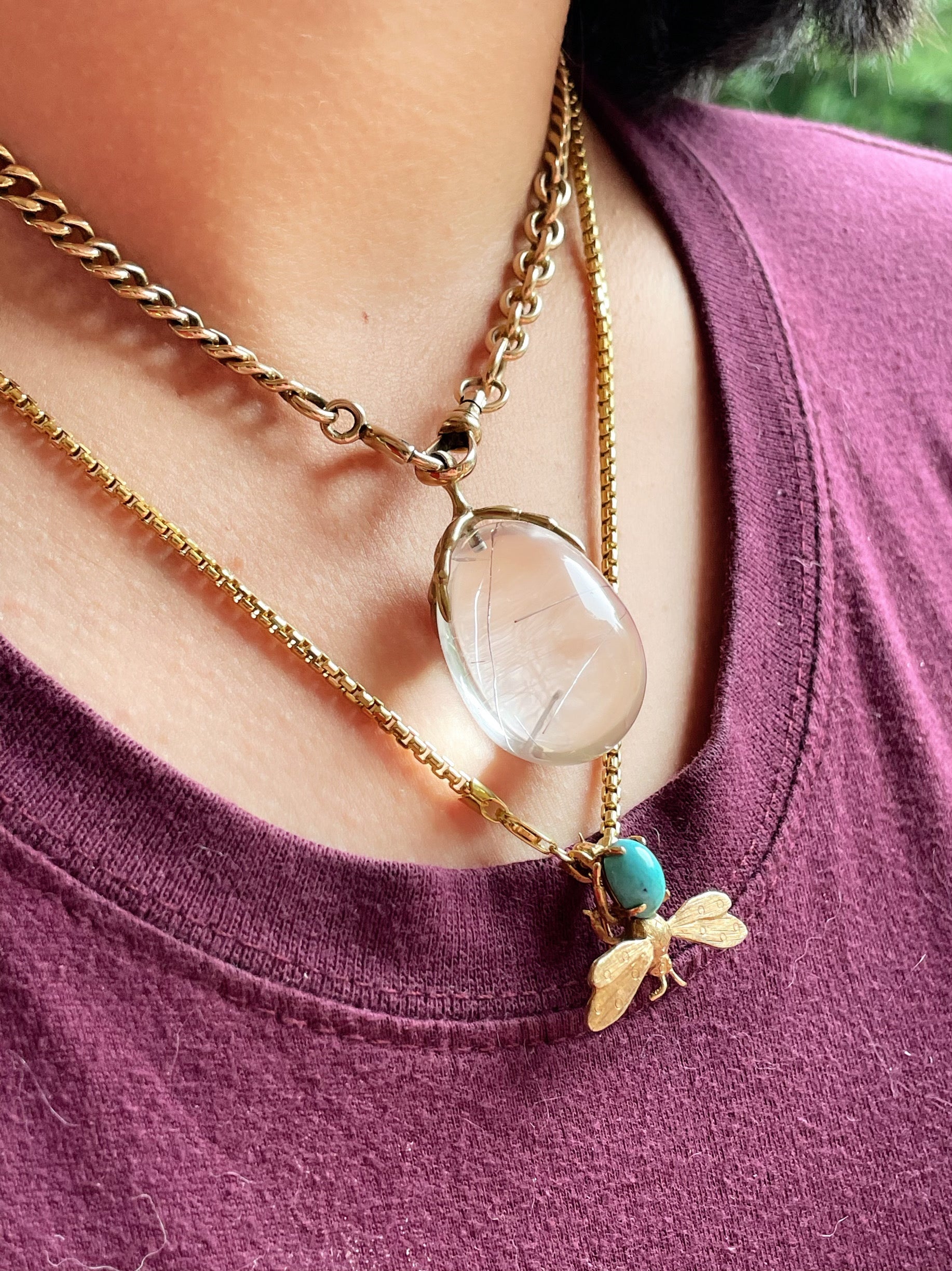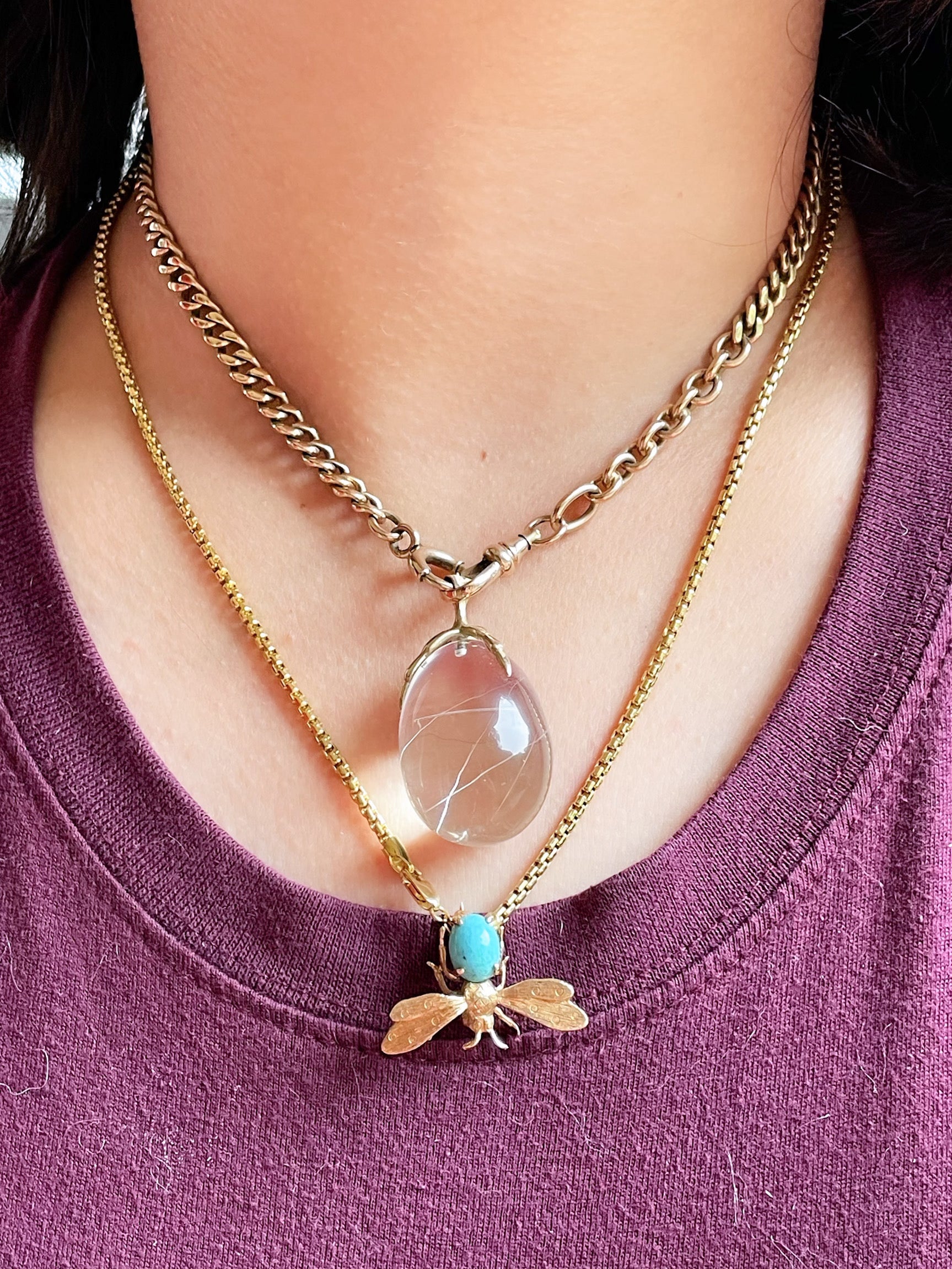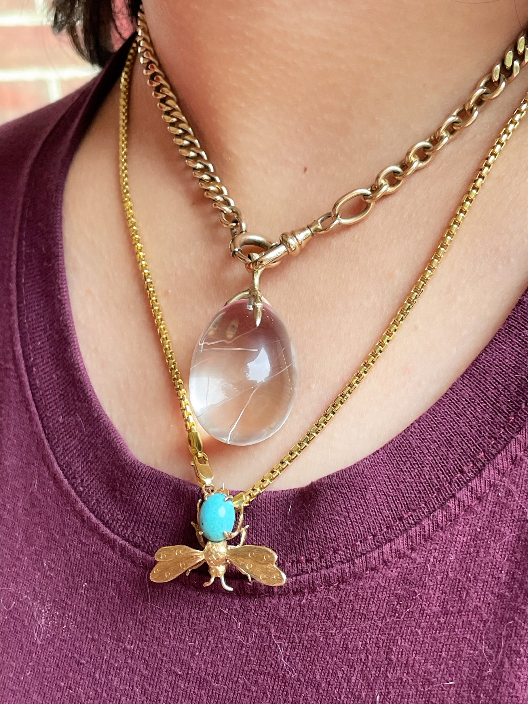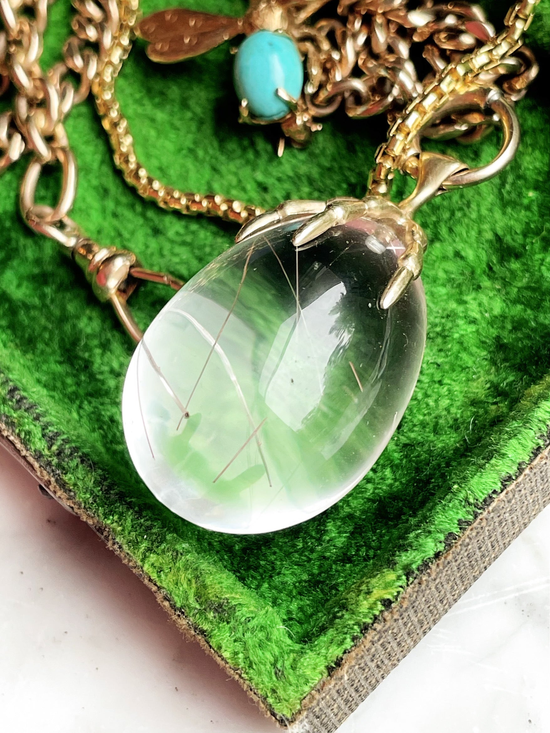 Description: A 10k tested rutile quartz egg captured by an avian claw in yellow gold. Annette Ferdinandsen created this 24ct crystal quail egg, representing the potential of life, as an amulet for the wearer.