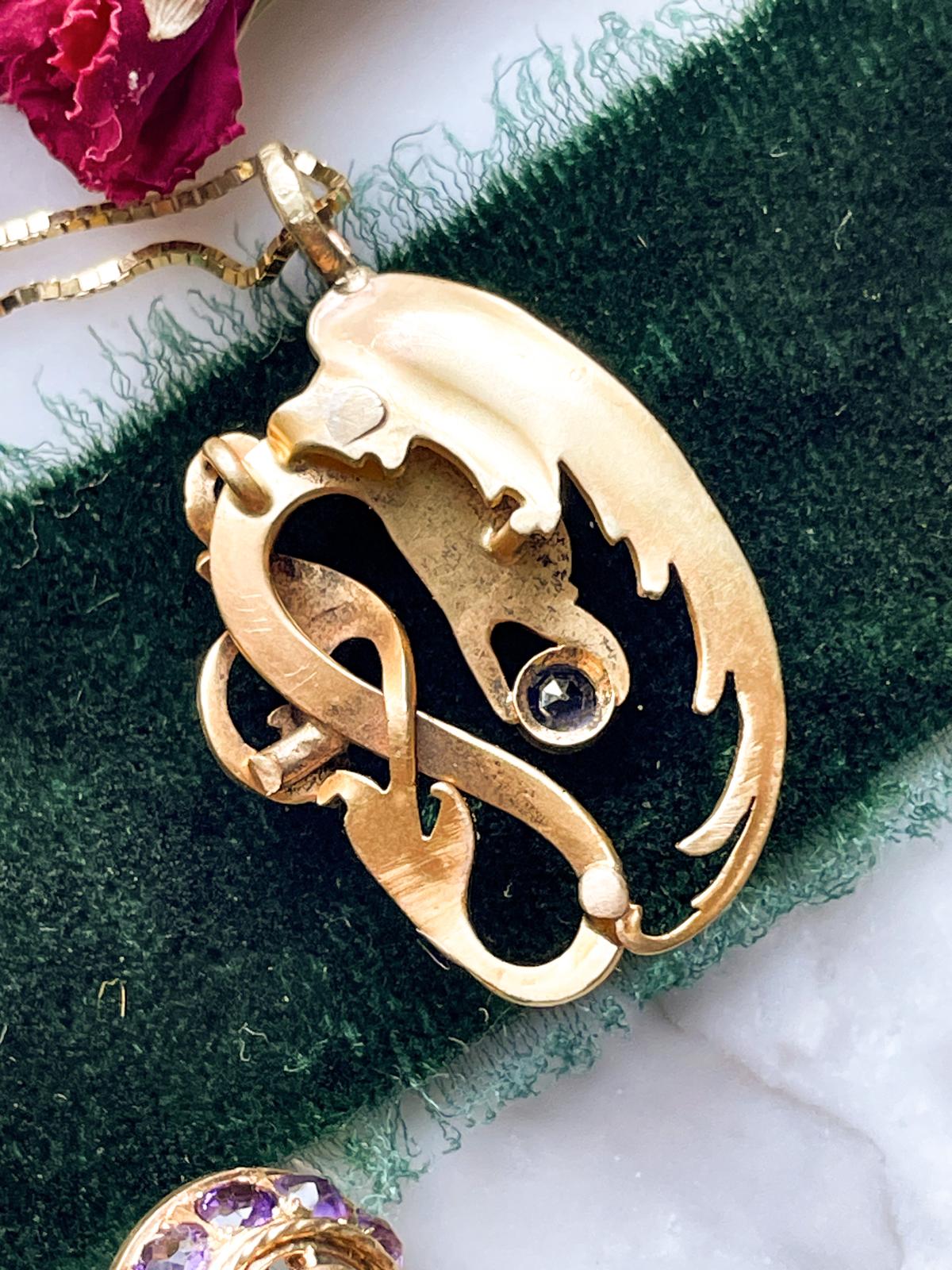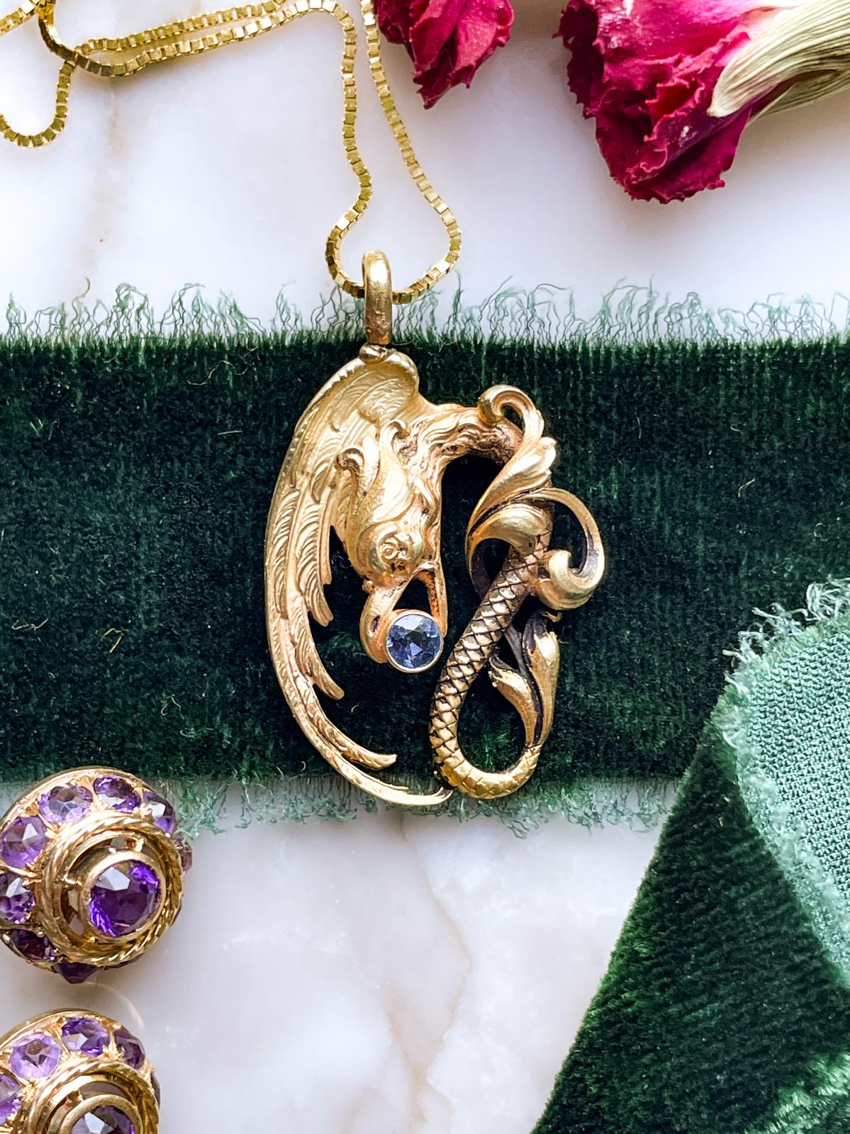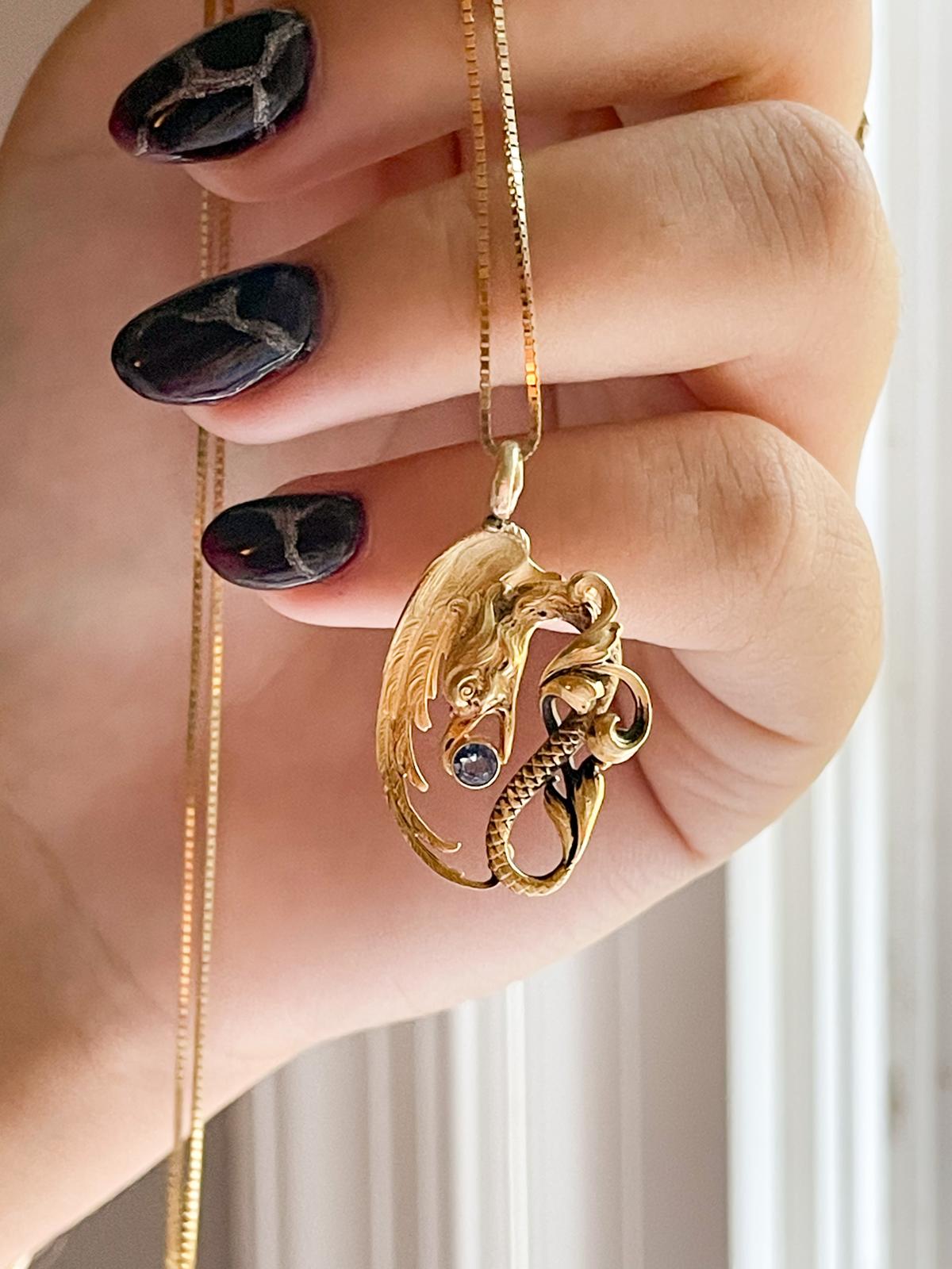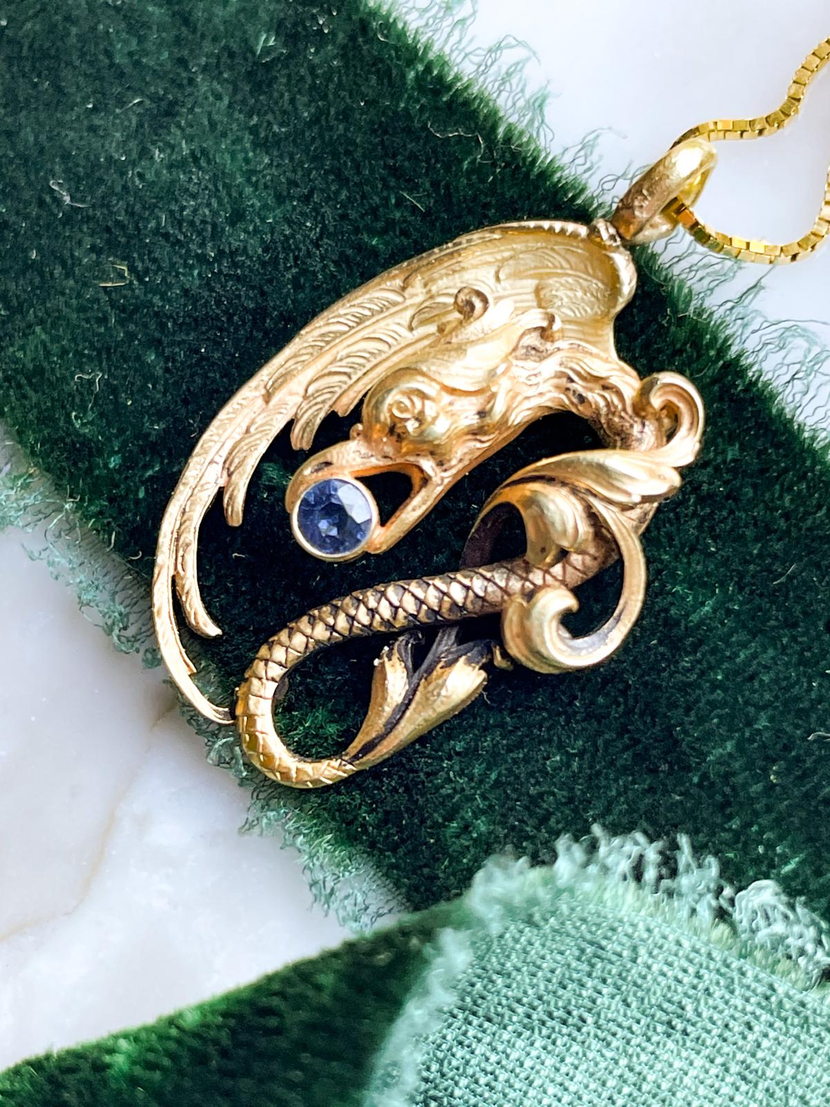 Description: An antique Art Nouveau c1900 14k tested mythical figural chimera with sapphire pendant in yellow gold. It is most likely a brooch conversion to a pendant and in very good condition.