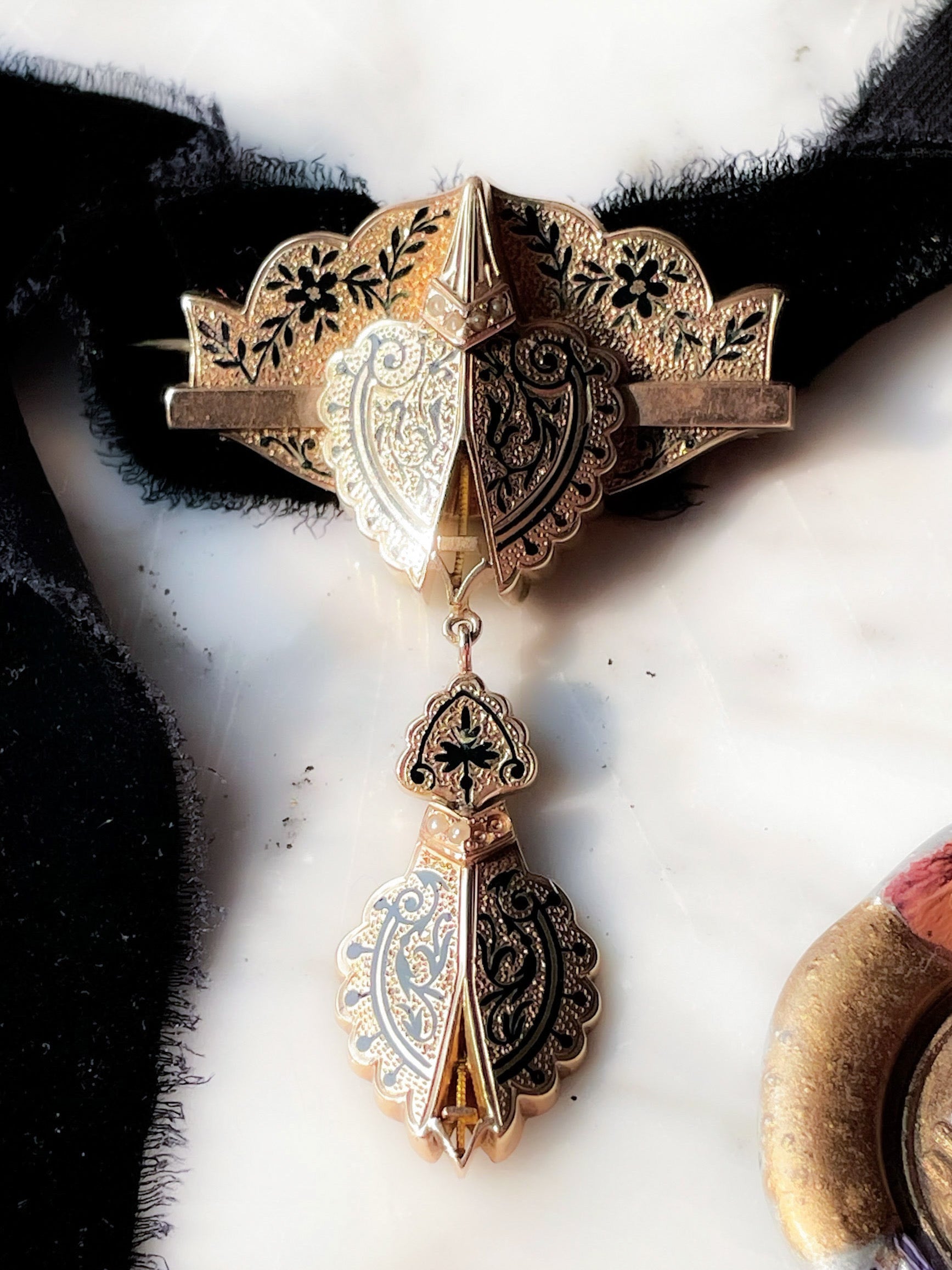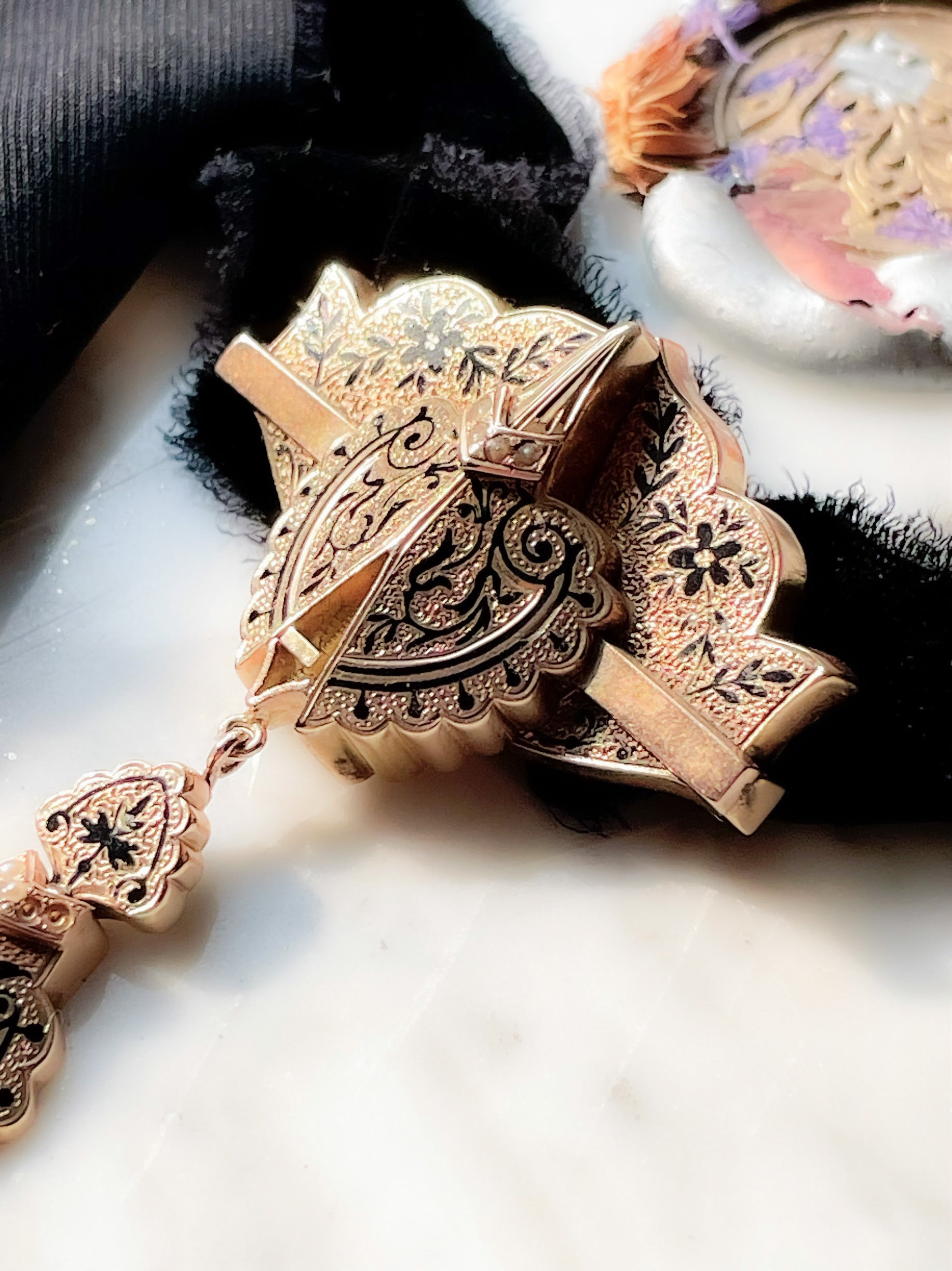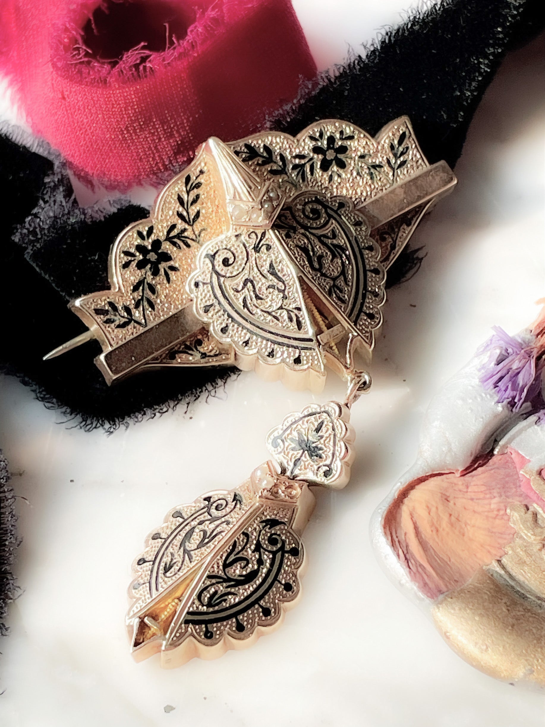 Description: An antique Victorian 14k tested taille d’epargne enamel brooch in yellow gold. The technique of black enamel tracery, taille d’epargne requires the design incised into the metal and then filled with enamel.
