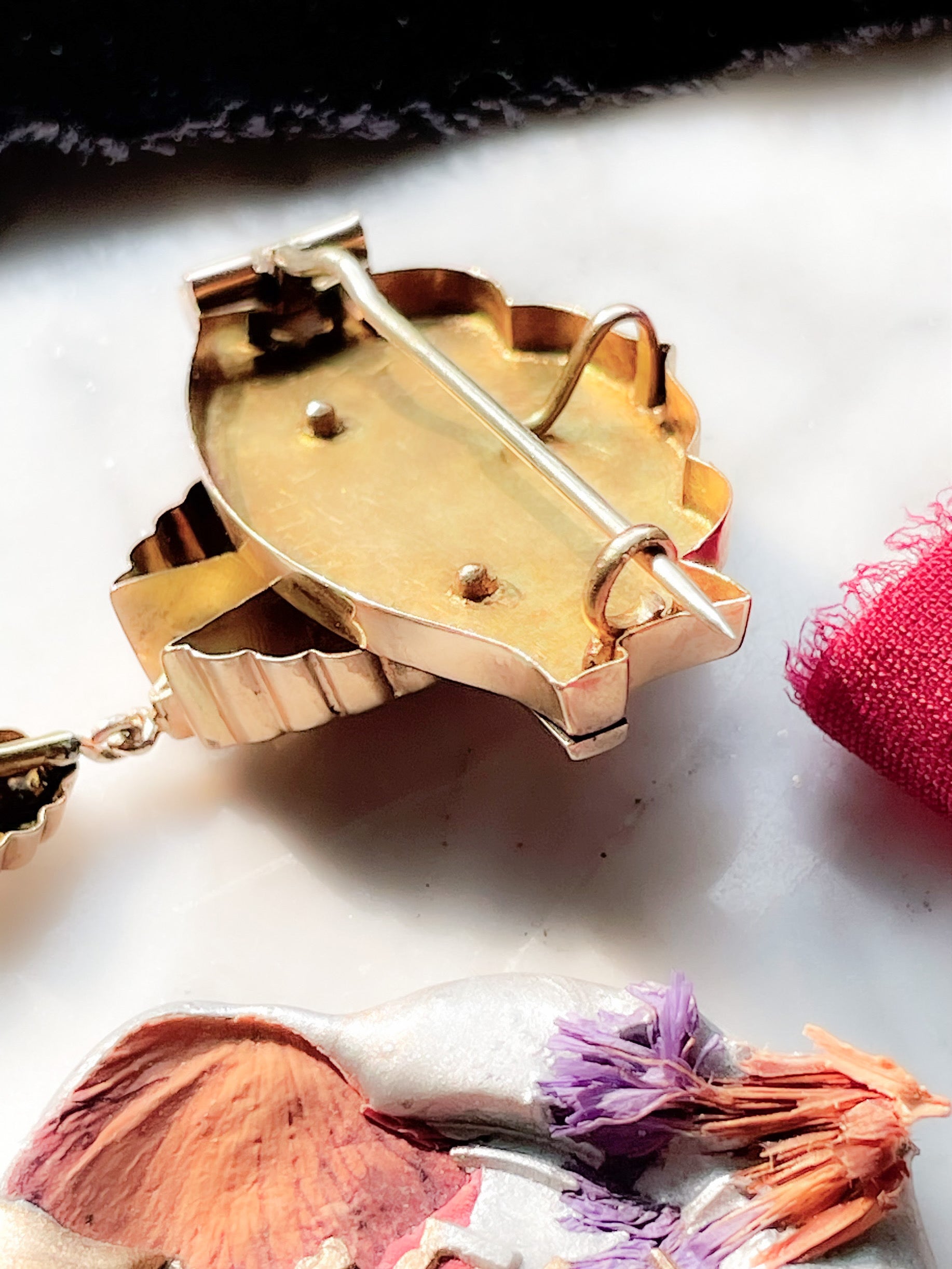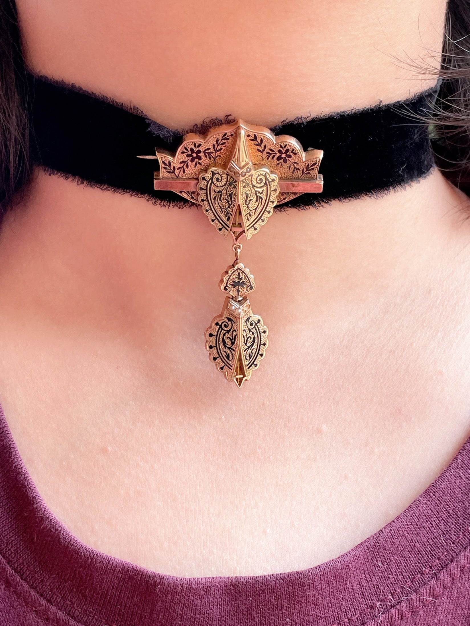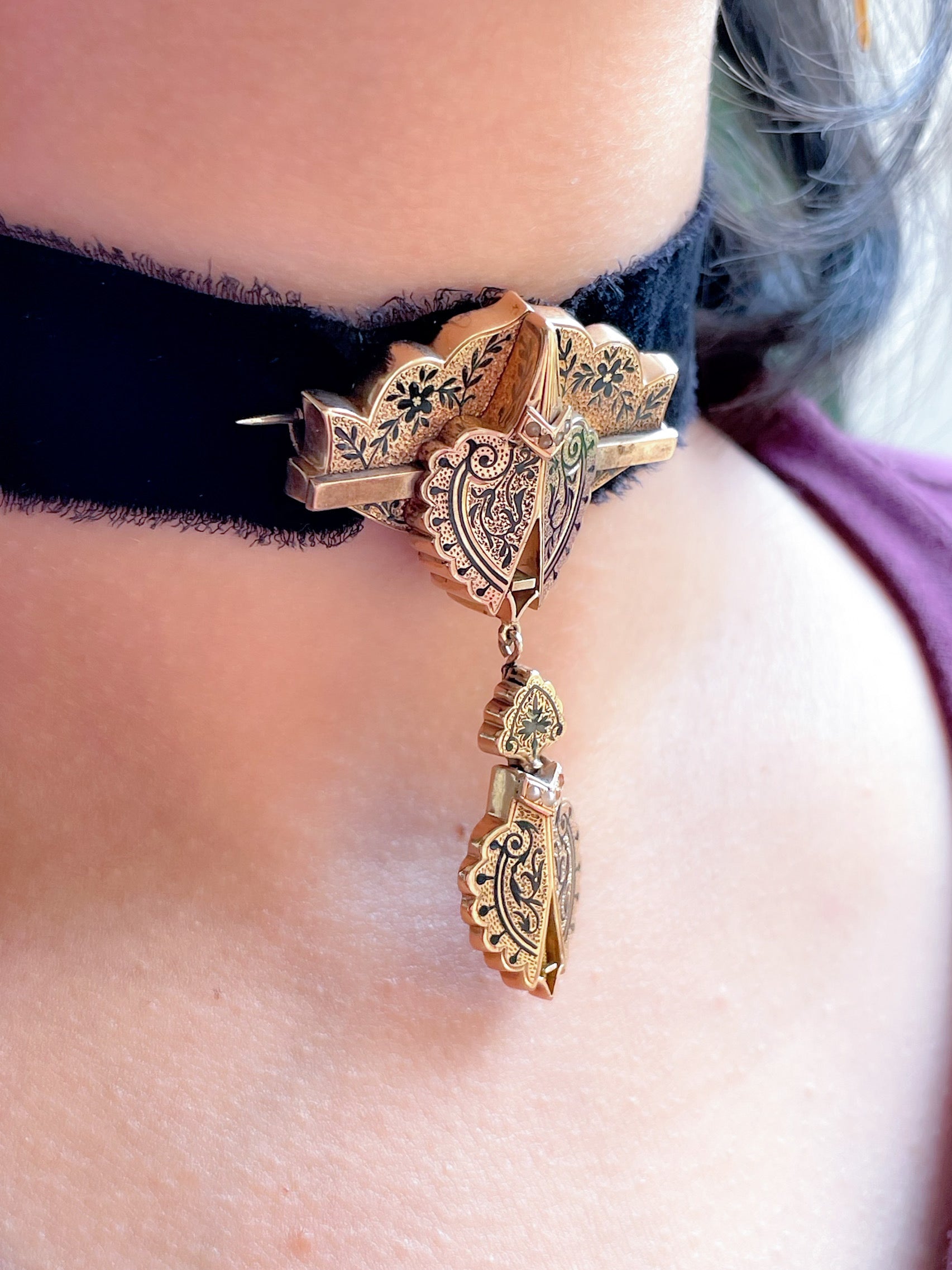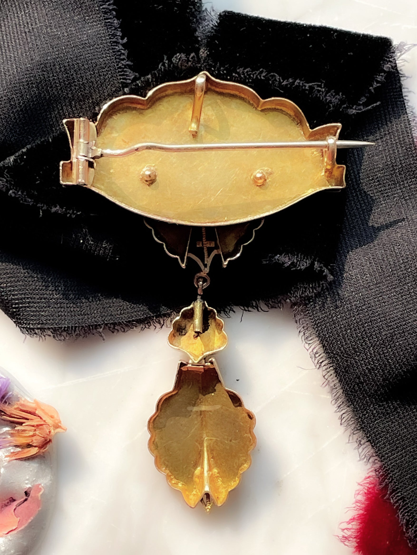 Description: An antique Victorian 14k tested taille d’epargne enamel brooch in yellow gold. The technique of black enamel tracery, taille d’epargne requires the design incised into the metal and then filled with enamel.