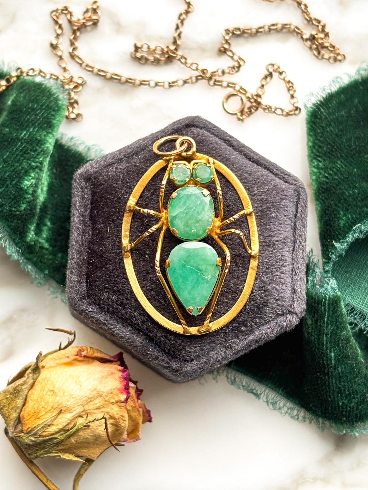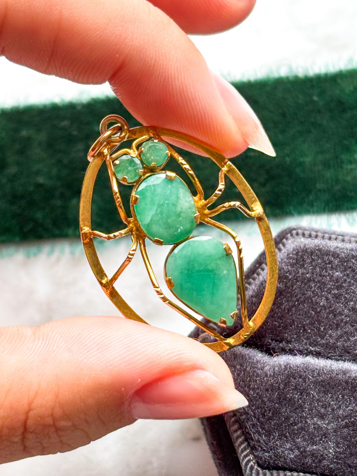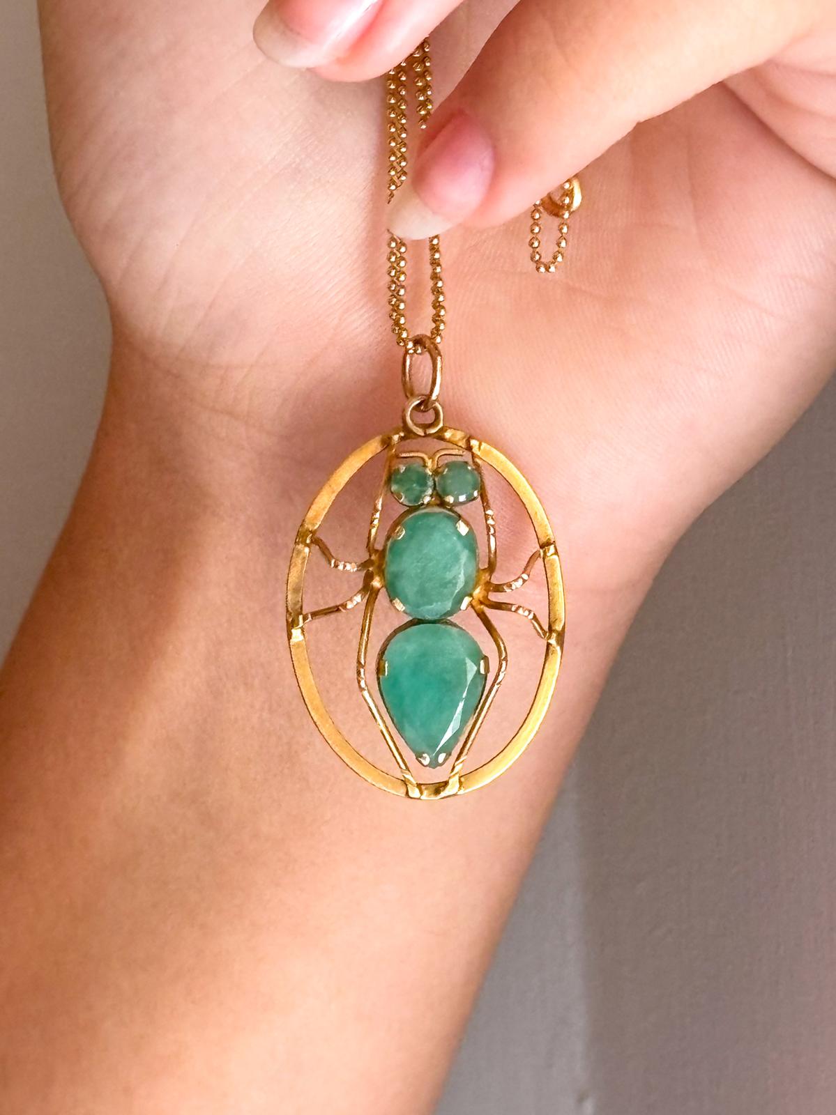 Description: A vintage 14k faceted chrysoprase insect pendant in yellow gold.