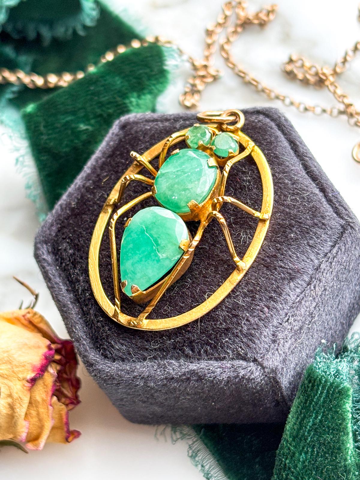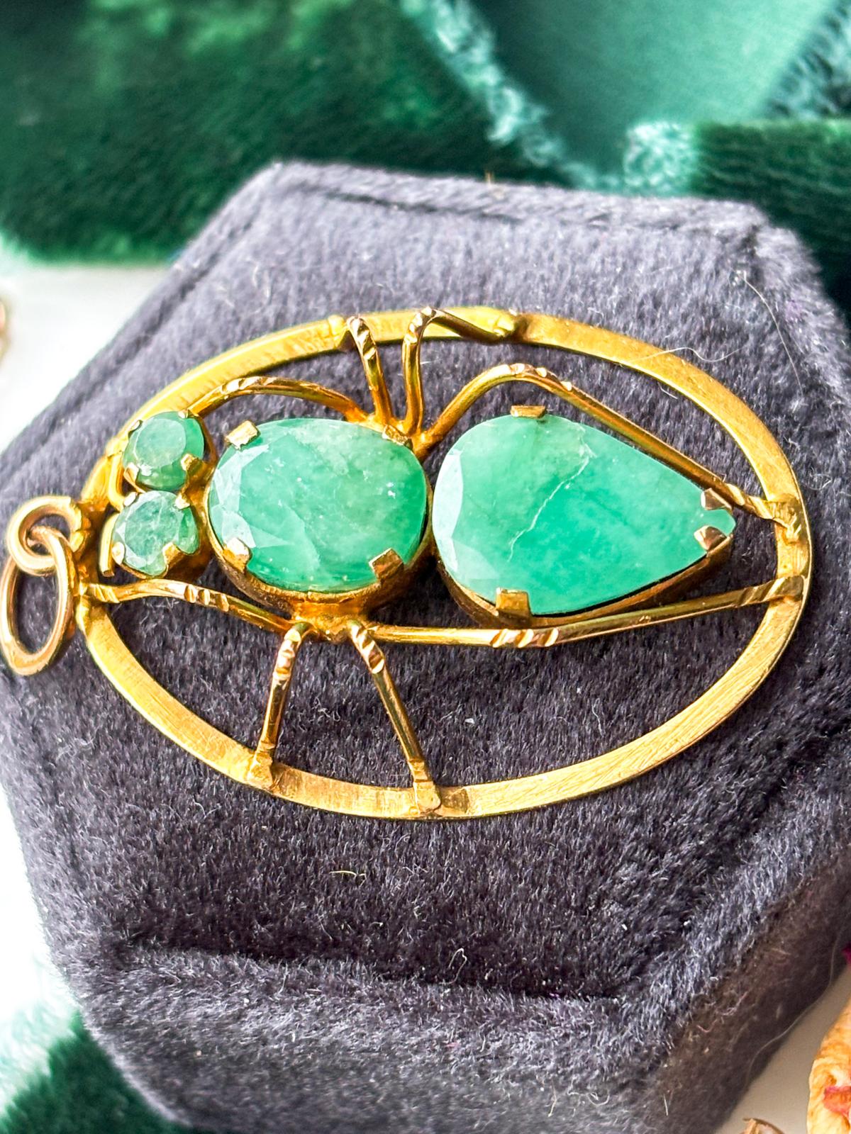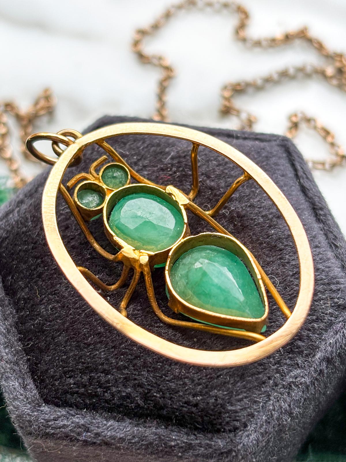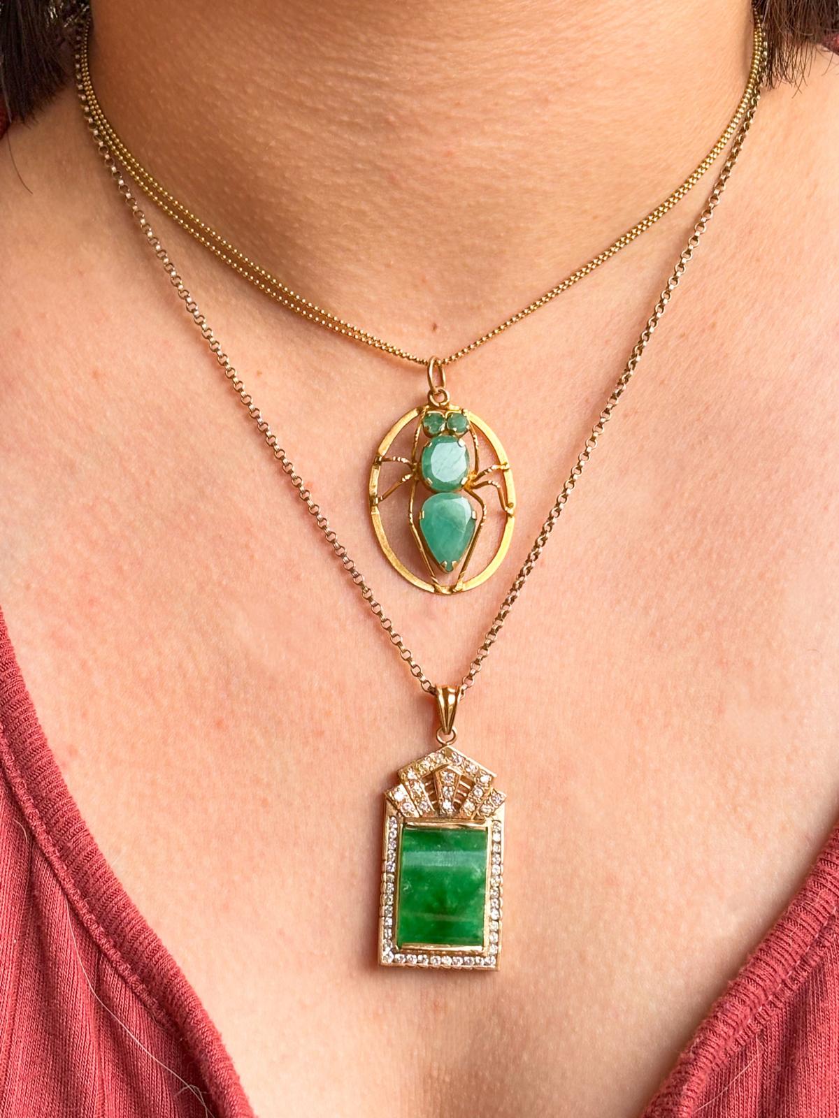 Description: A vintage 14k faceted chrysoprase insect pendant in yellow gold.