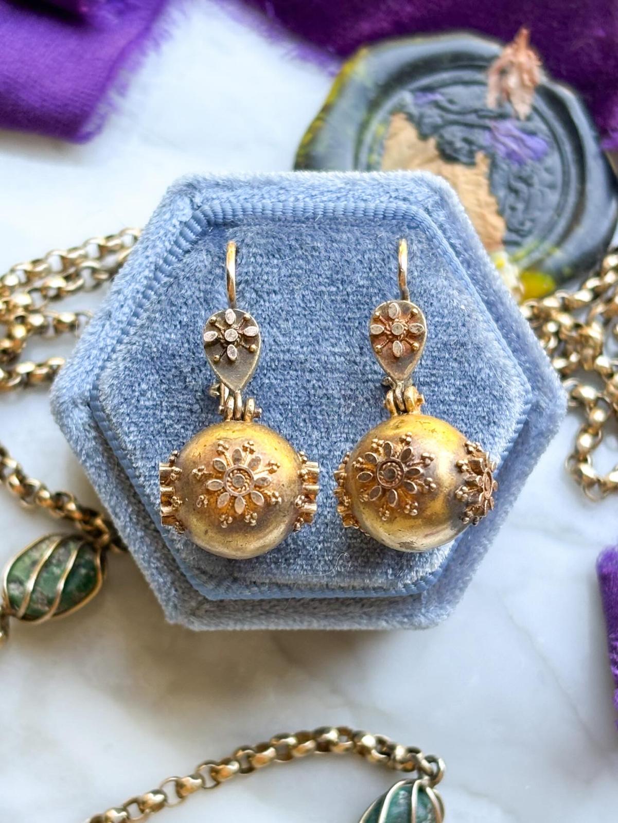 Description: An antique Victorian 22k xrf tested articulated ear bobs with 12k xrf tested wires in warm yellow gold. The antique patina was left untouched with polishing left to her new custodian.