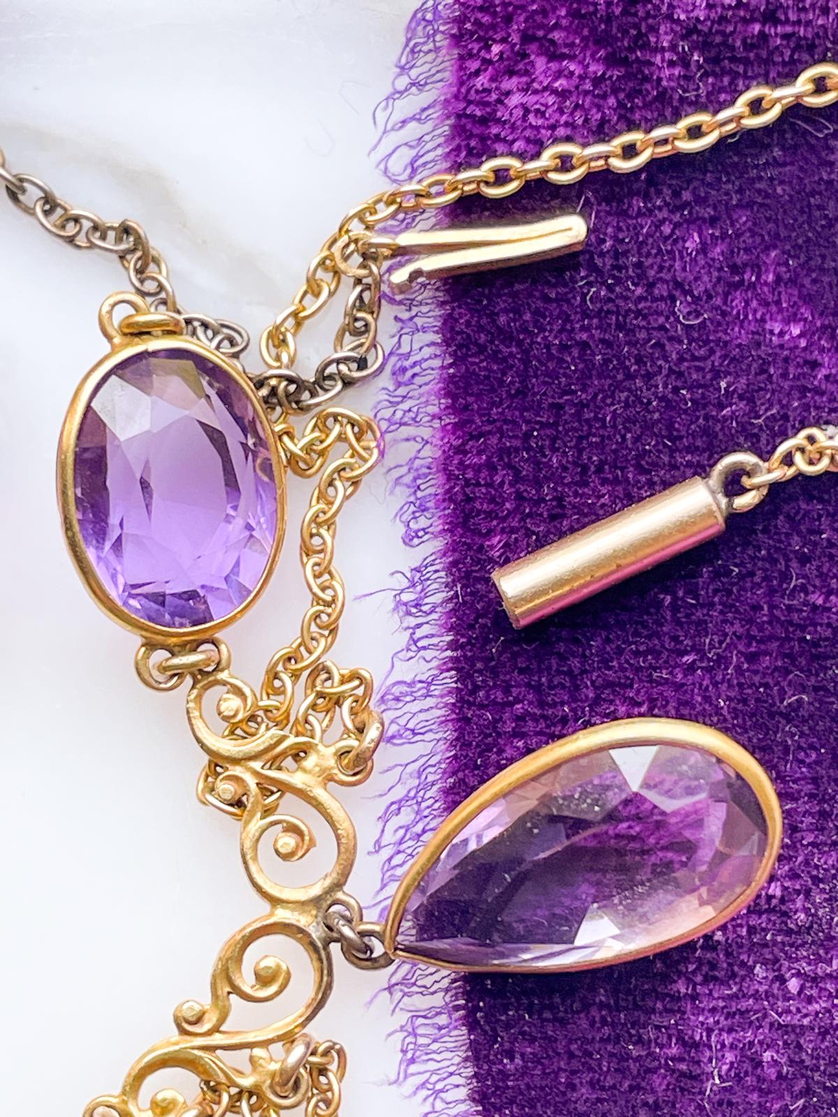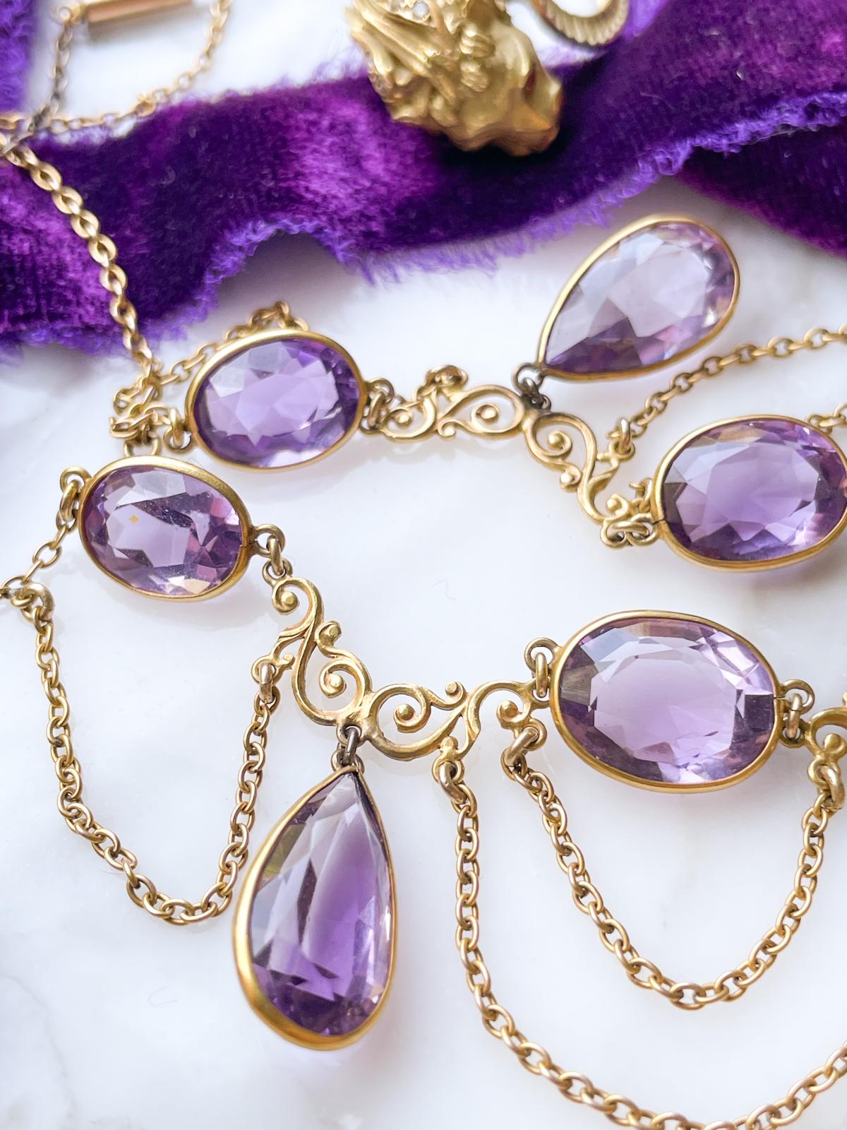 Description: This is an antique Art Nouveau 10k tested 30cttw amethyst festoon necklace in yellow gold. It has a barrel torpedo clasp.