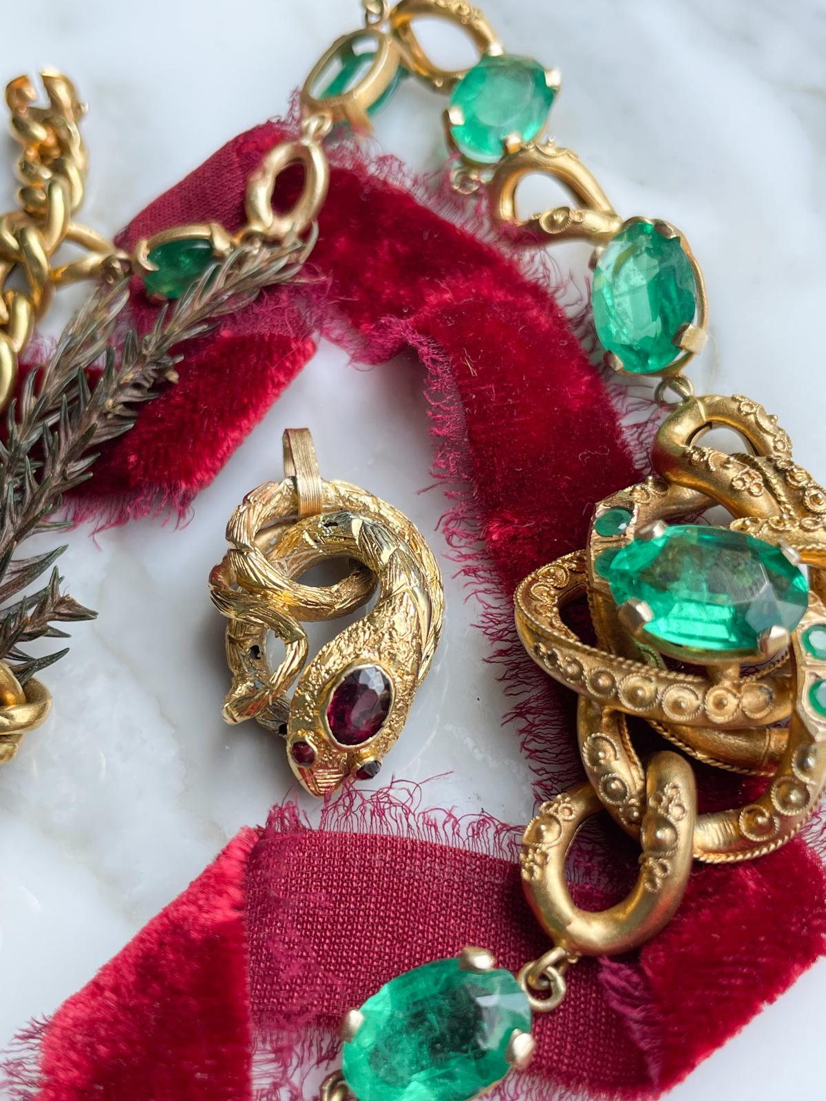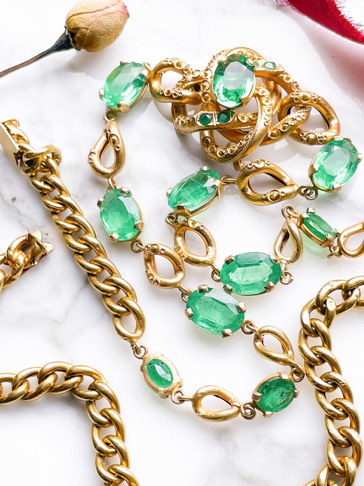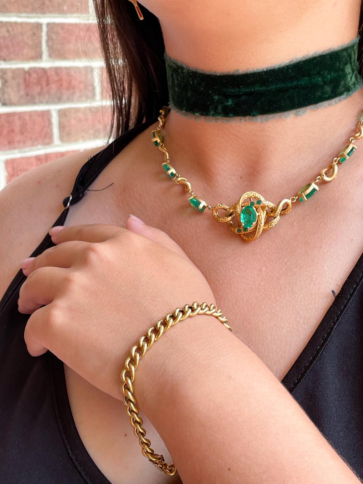 Description: An antique Victorian 12k stamped K12 Etruscan Revival 24.00cttw natural emerald necklace with curb link extender in warm yellow gold. The two pieces can be worn separately or together as the pieces have identical box clasps. There is some minor wear on a few of the links, but not noticeable when worn.