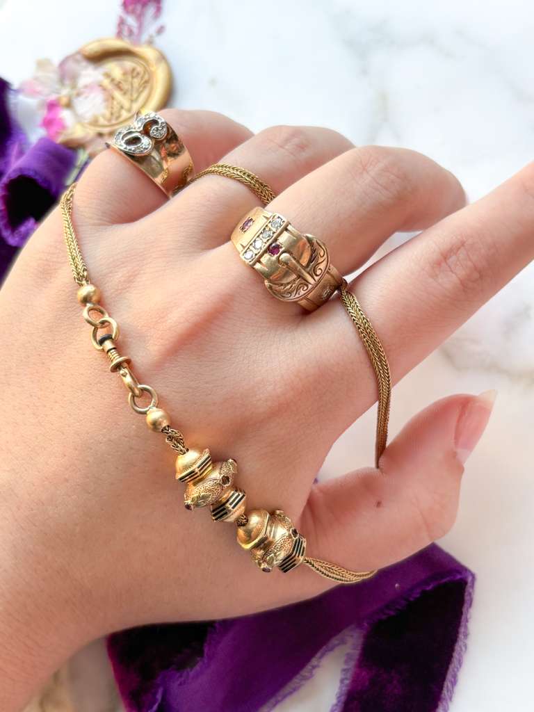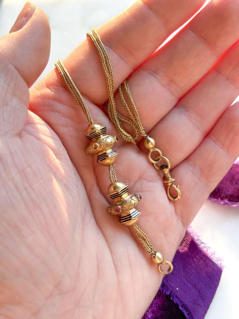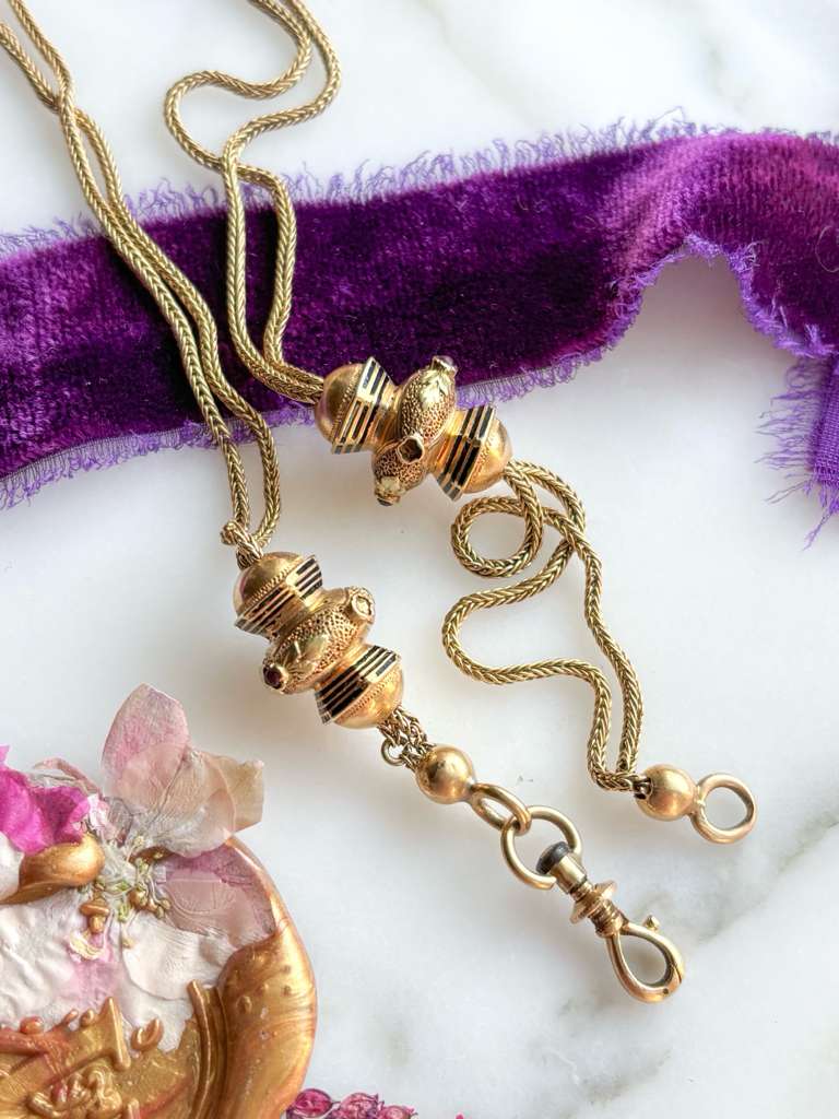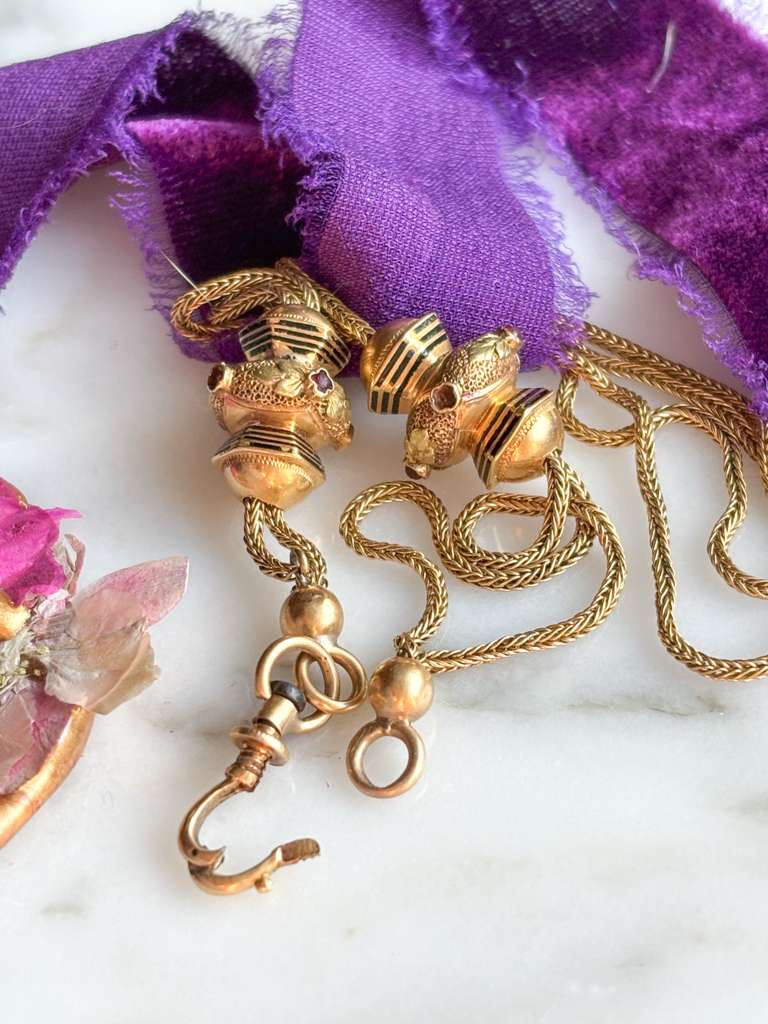 Description: An antique French Belle Époque 18k tested and stamped (clear French eagle touché marks on both the swivel dog clip and jump ring) watch chain with black enamel slide stations in yellow gold. The stations have rubies set around the floral barrel; however, three rubies require replacement. We leave this decision to replace with the new custodian. Measuring 12” in total length, this was likely a converted segment of a long guard or half of a double Albert watch chain.