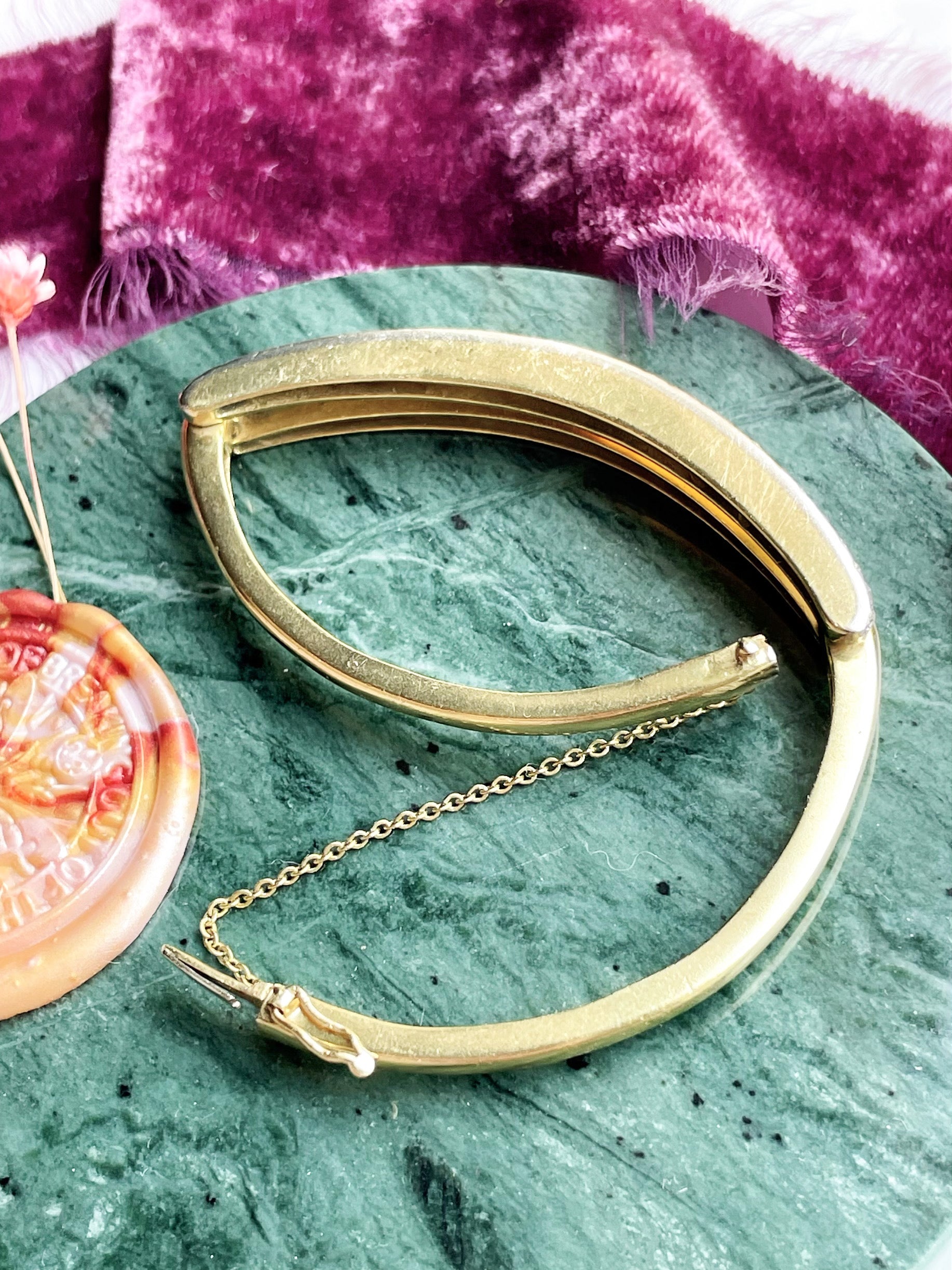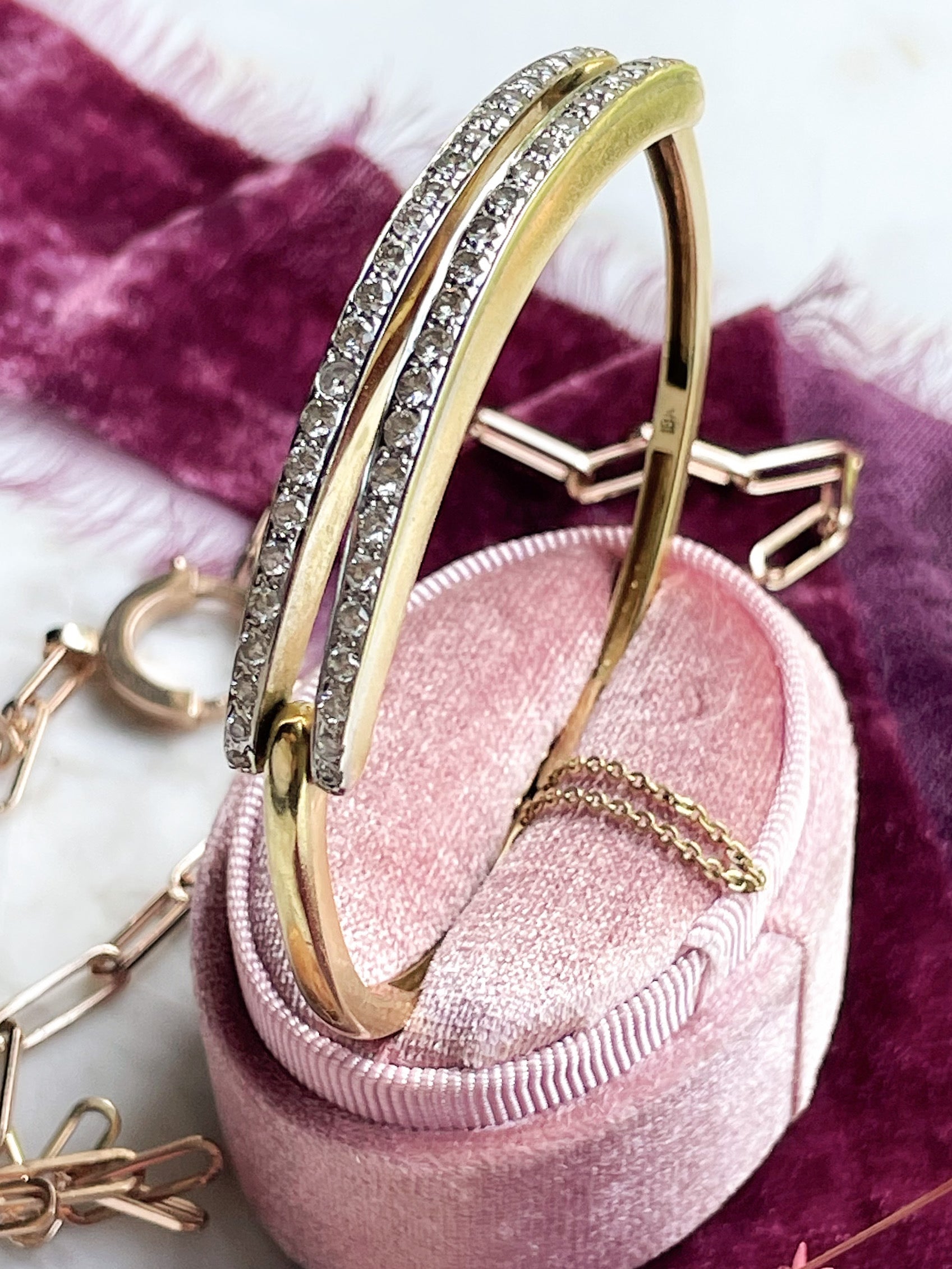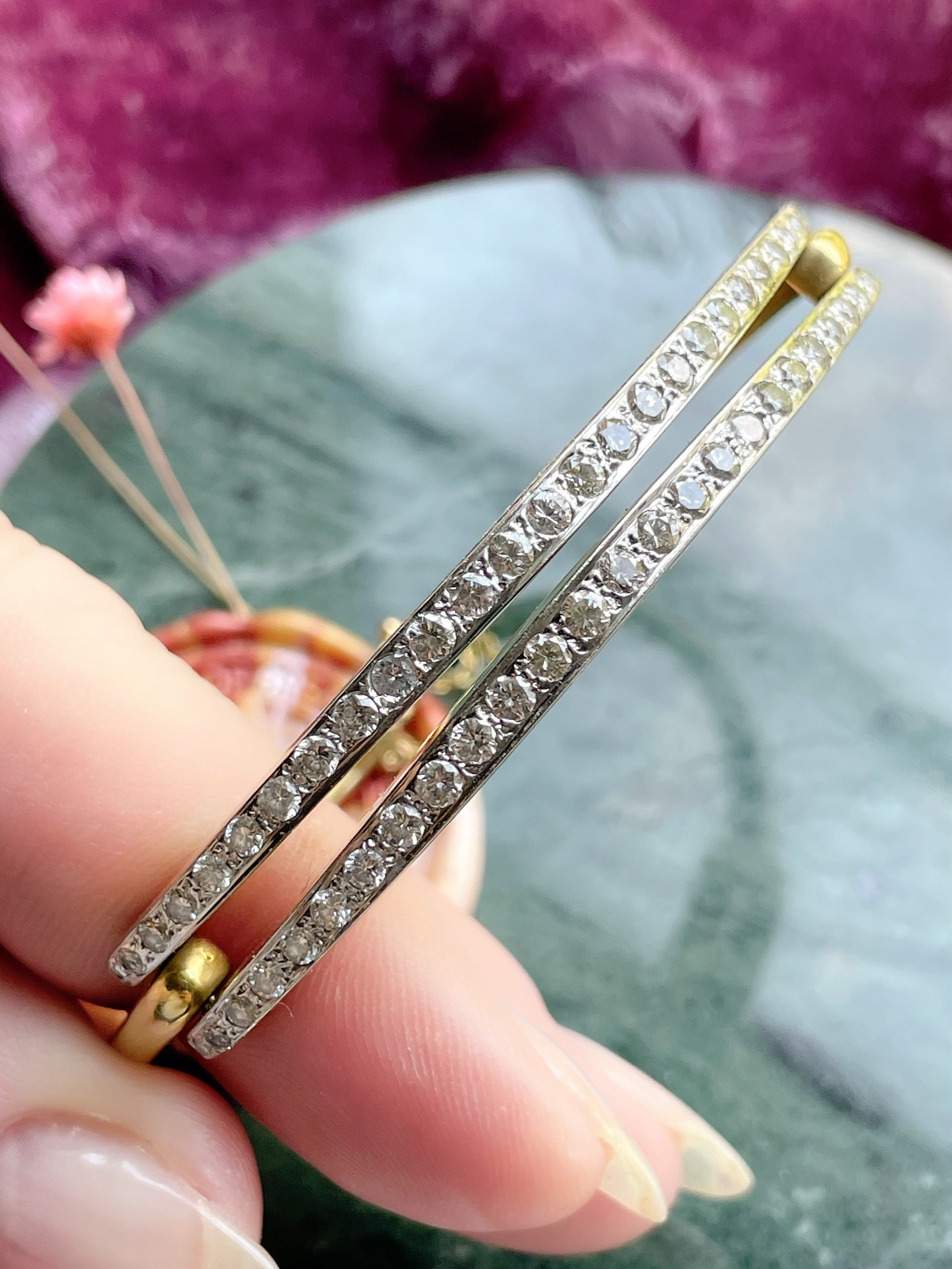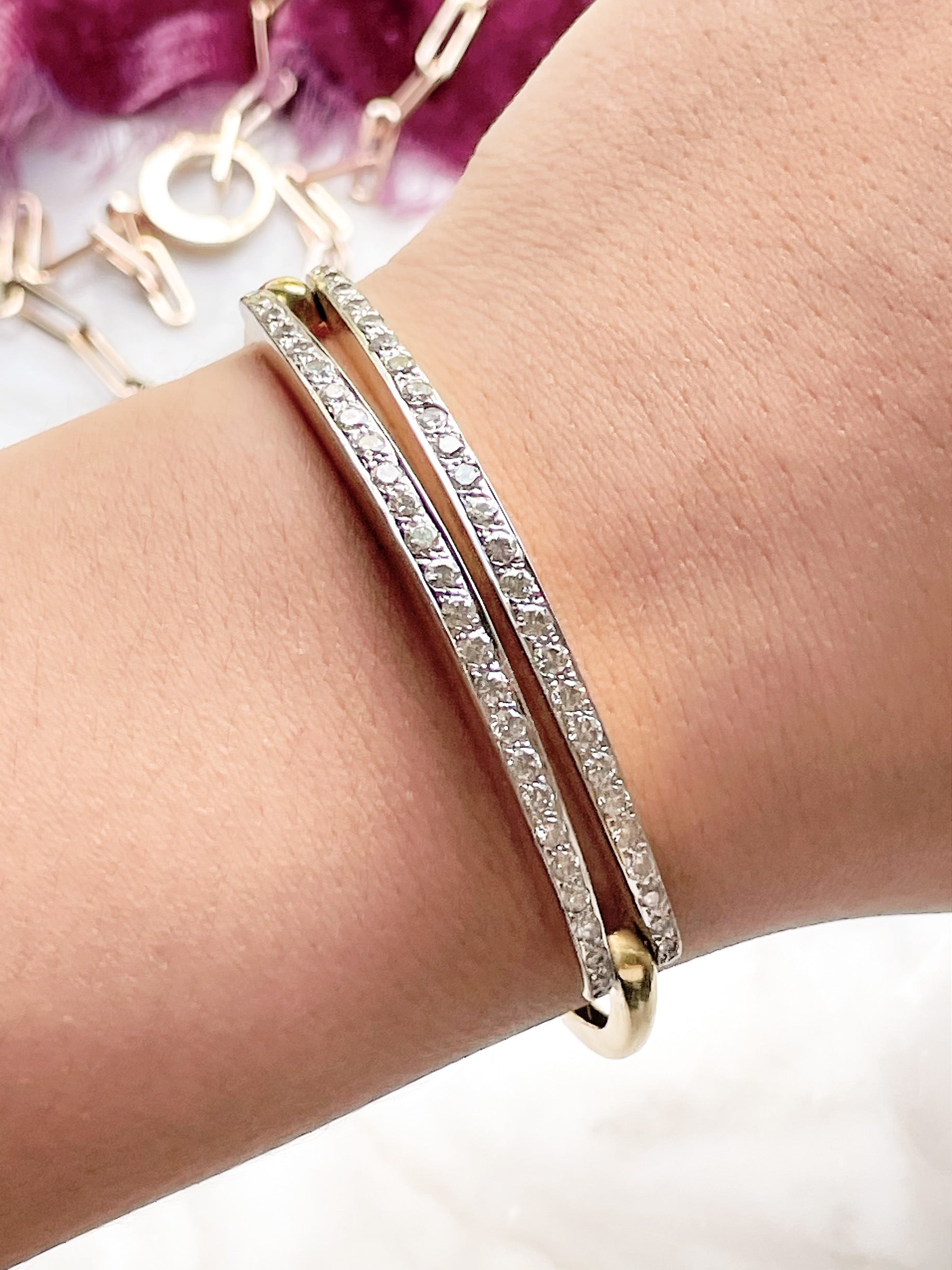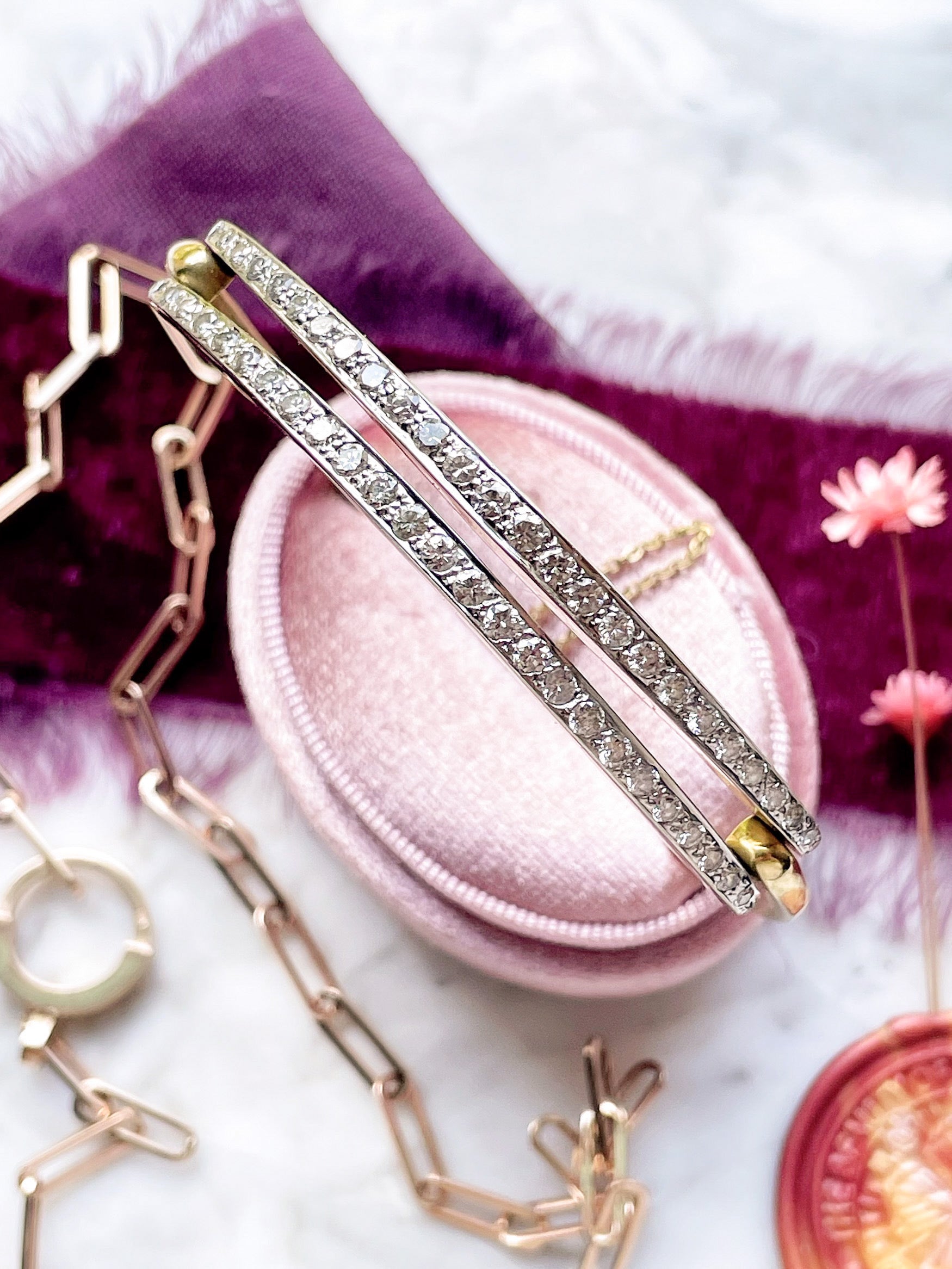 Description: A vintage 18k stamped 2.00cttw two row diamond bangle in yellow gold. The diamonds are set in white gold. The center clasp with double hinge makes this beauty easier to put on without worrying about breaking the security chain. There is one small mark near the clasp (please refer to all photos and video) but negligible when worn.