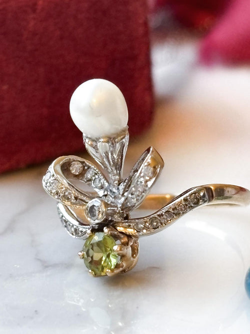 14k Antique Edwardian Peridot and Diamond Bow Gold Ring