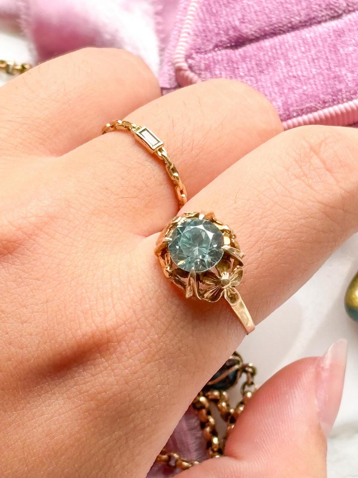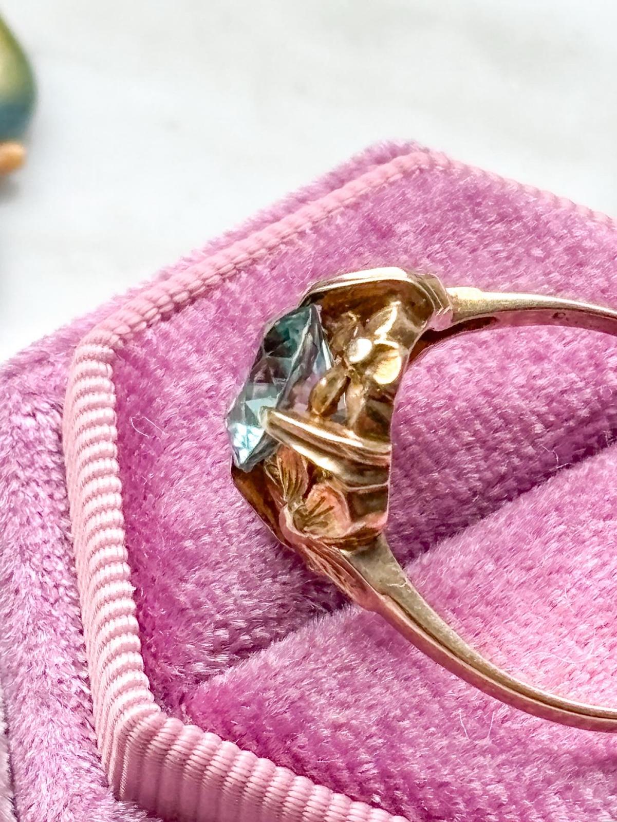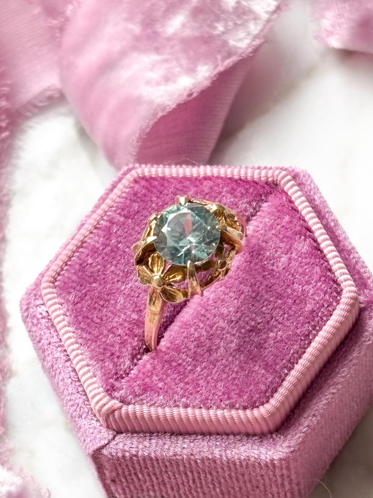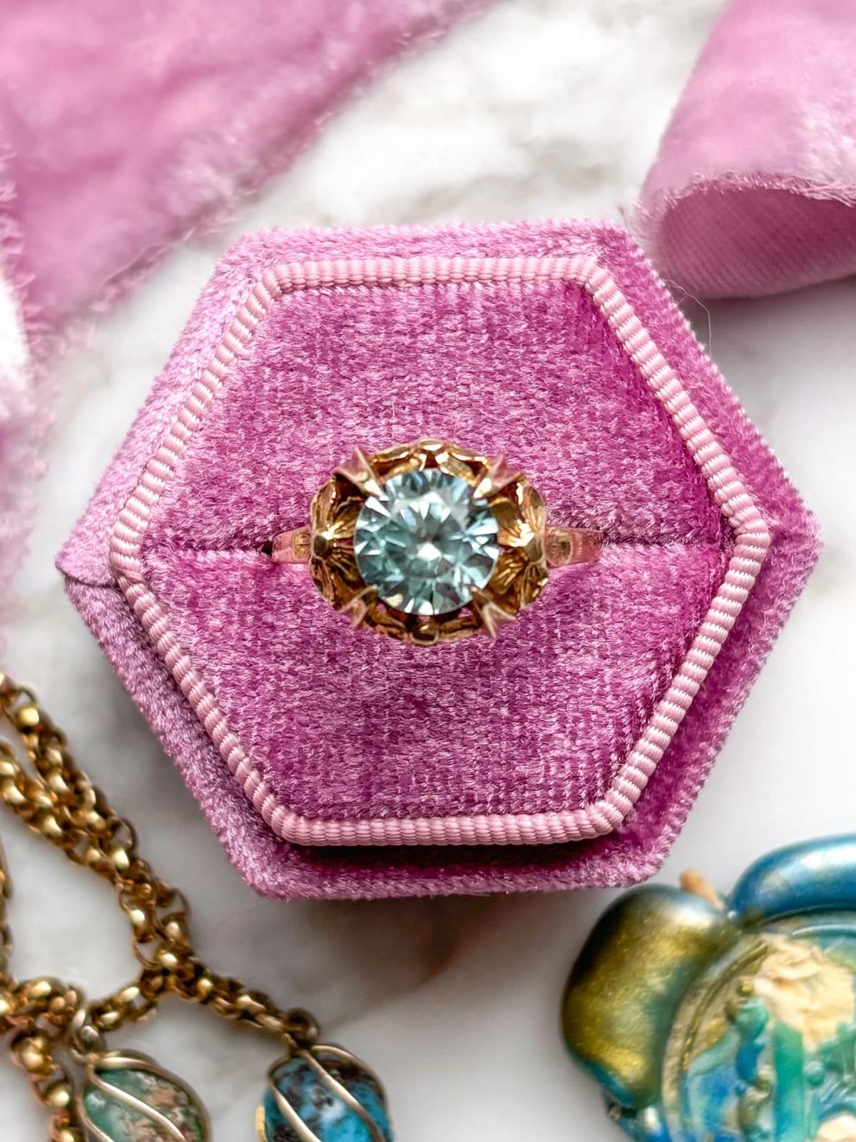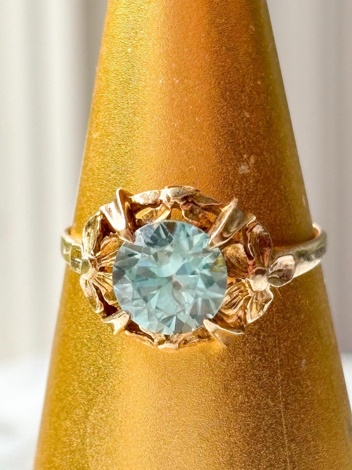 Description: A vintage 10k stamped ~2.50ct blue zircon in yellow gold.