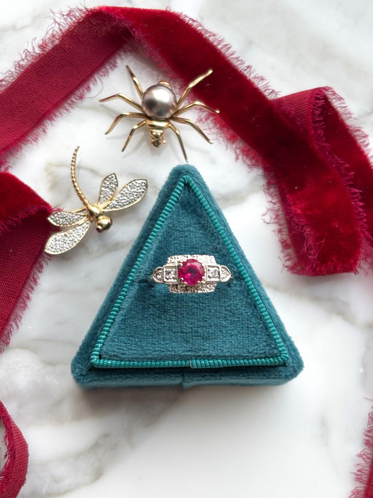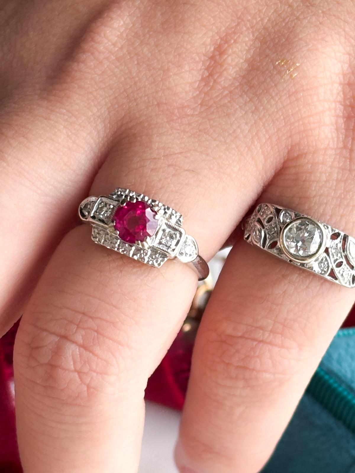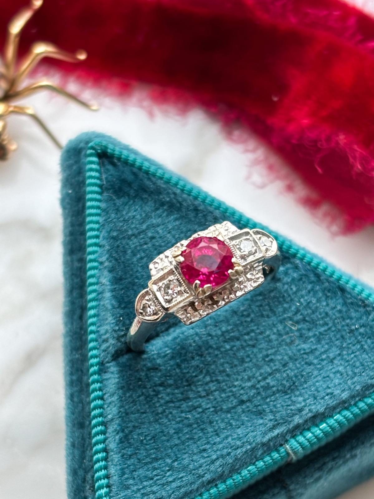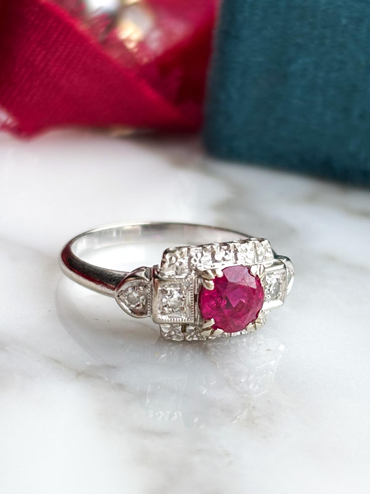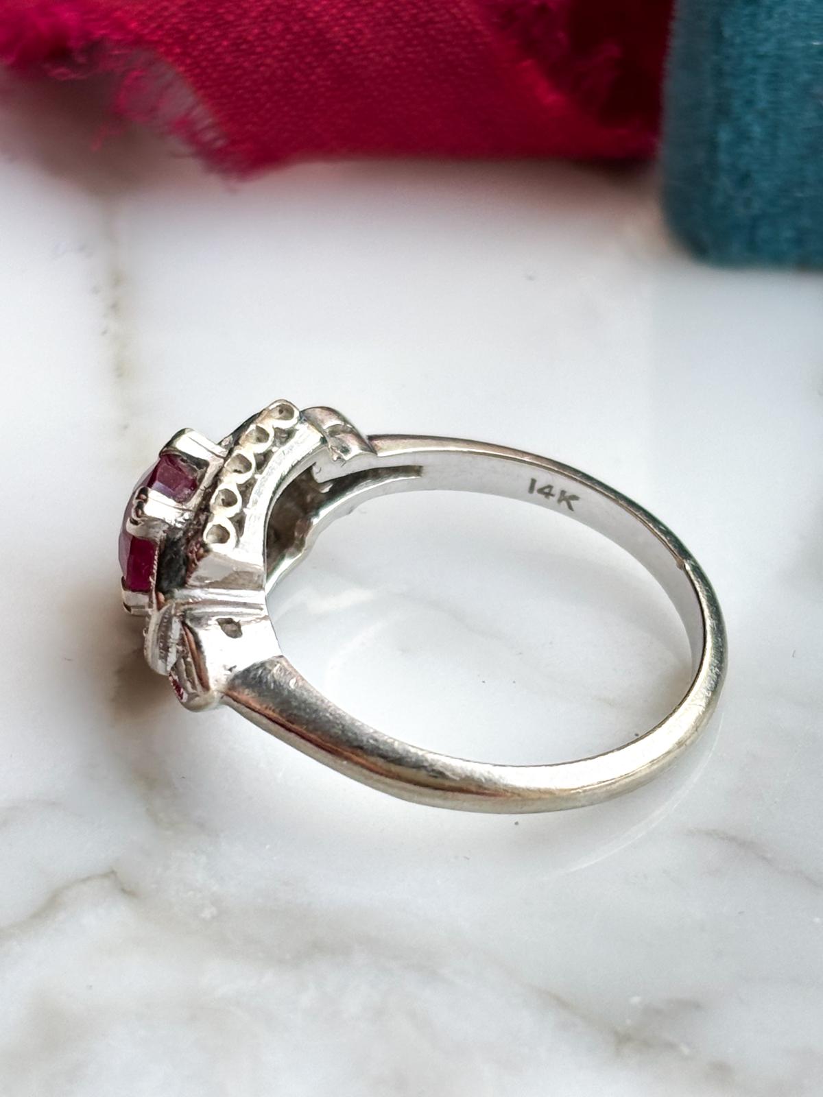Description: An antique Art Deco 14k stamped diamond and natural ruby ring in white gold.