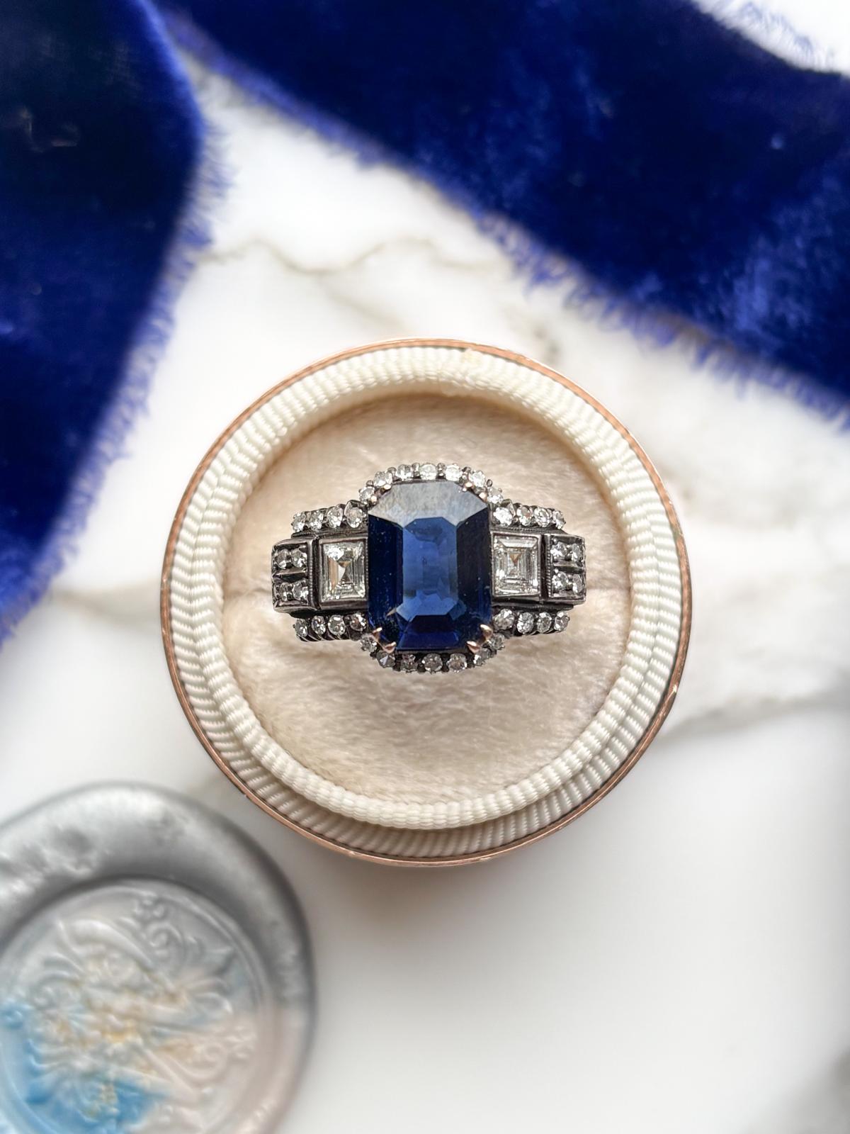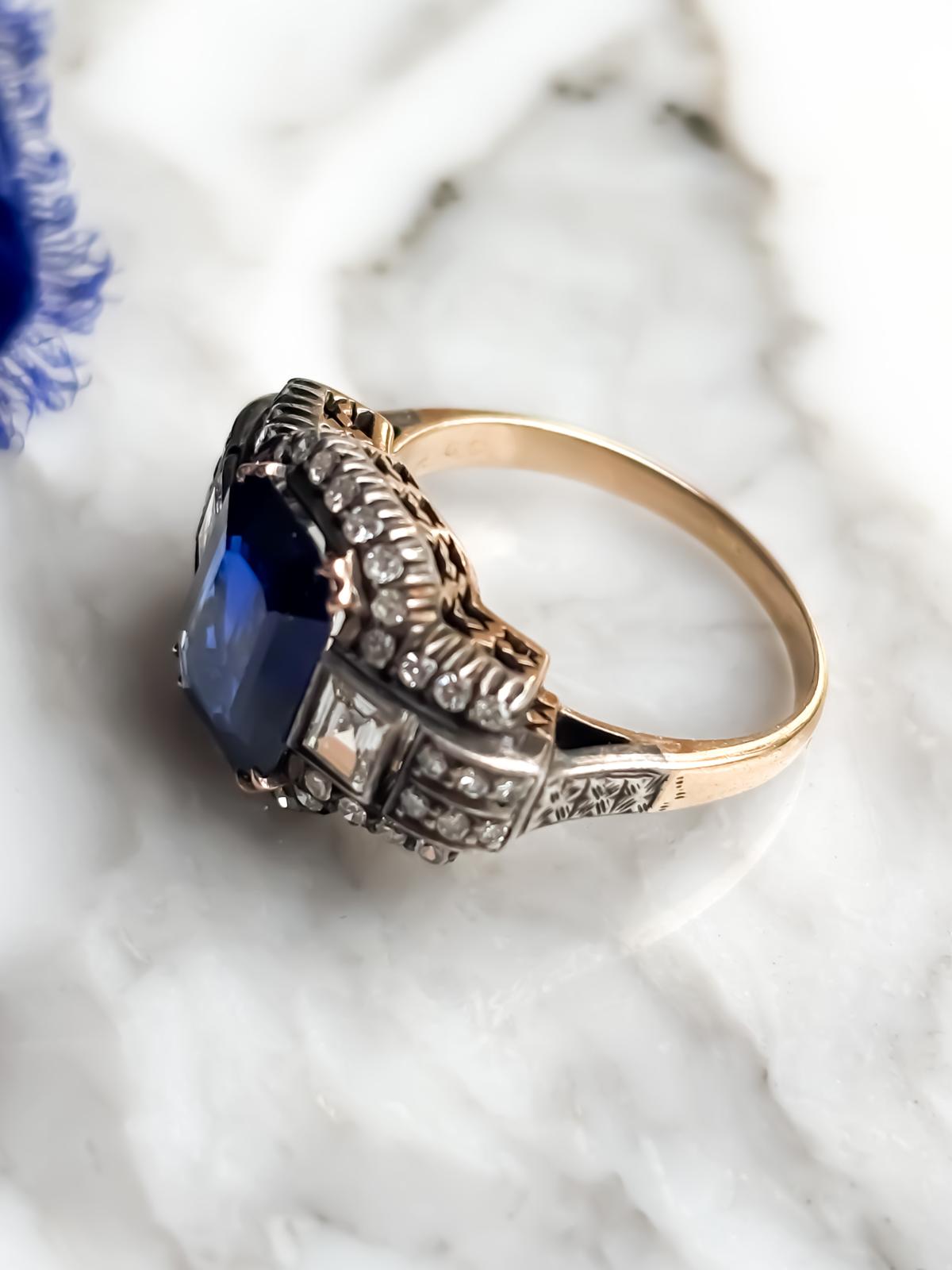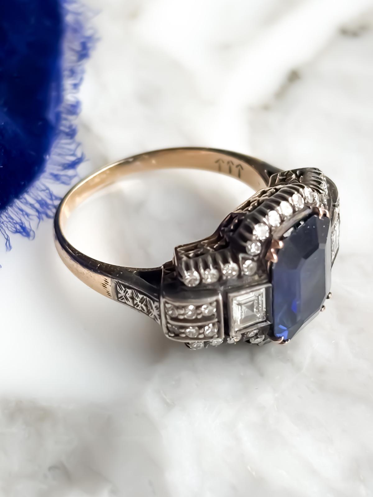 Description: An Art Deco 14k tested sapphire and diamond ring, with a maker’s mark indicative of continental workshop production. The approximately 4.15ct step-cut, elongated octagonal lab-created sapphire, consistent with Art Deco production, is accented with 0.40cttw step-cut diamonds and 0.60cttw single-cut diamonds.