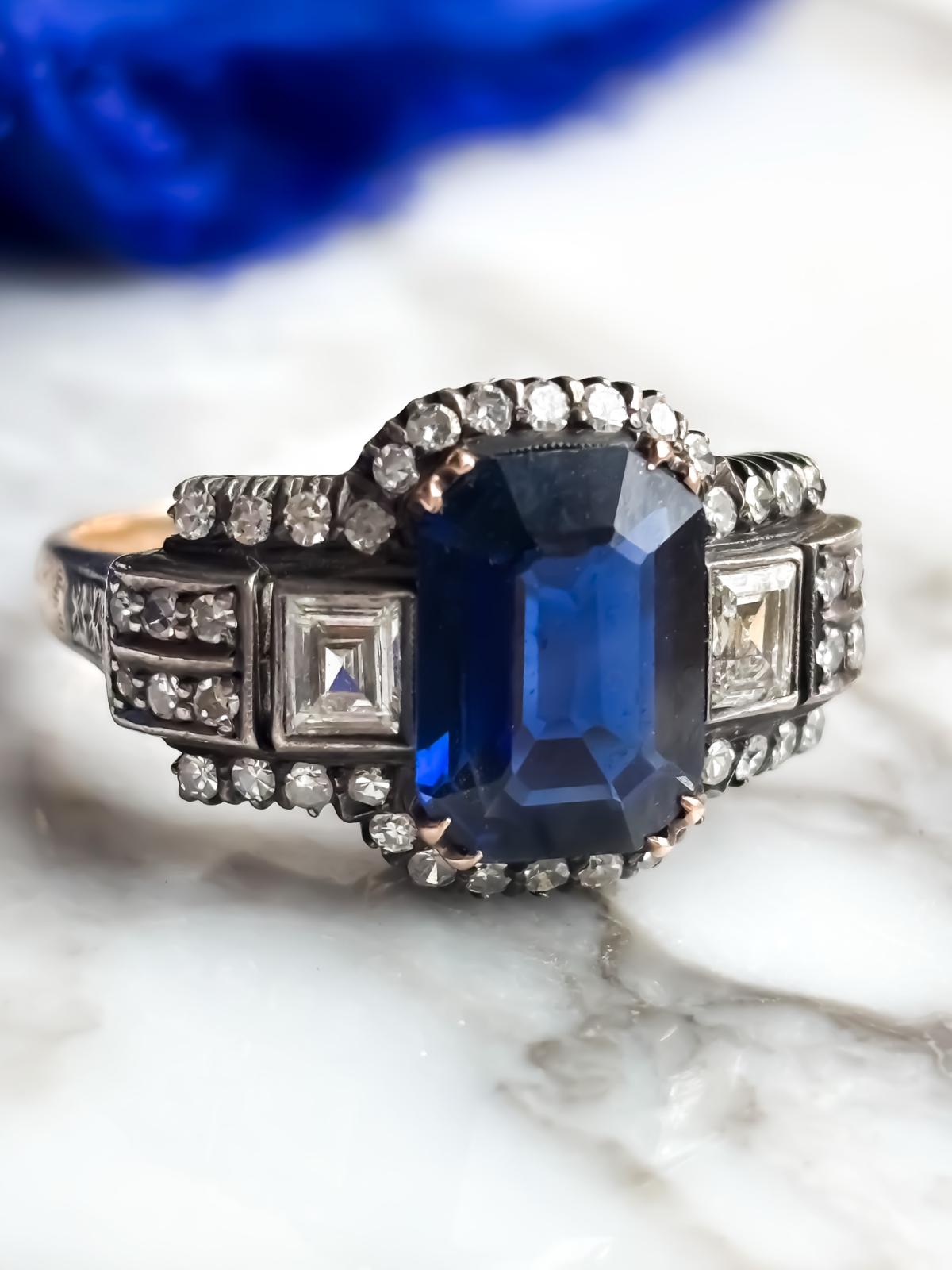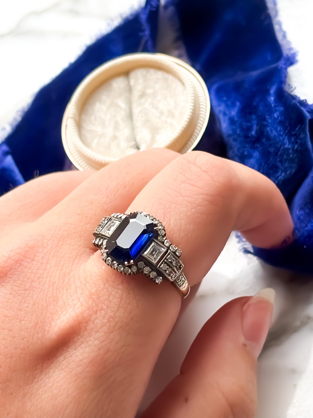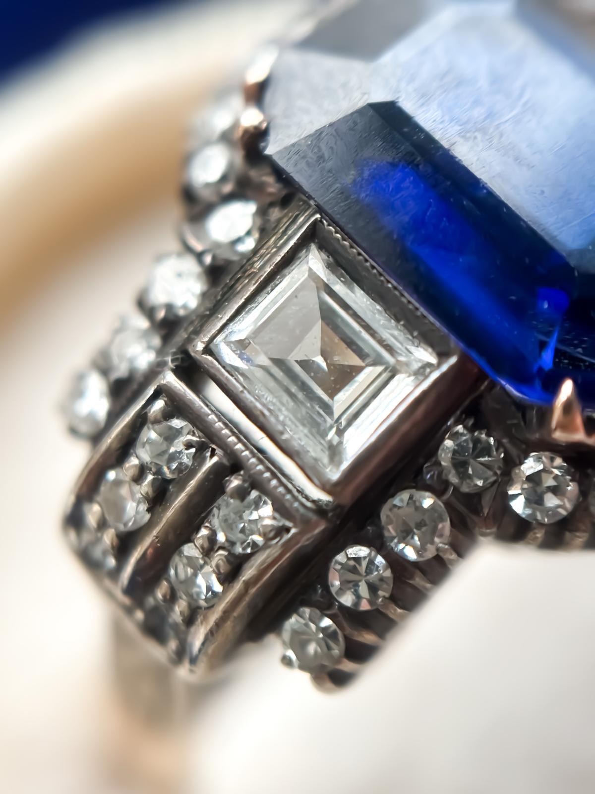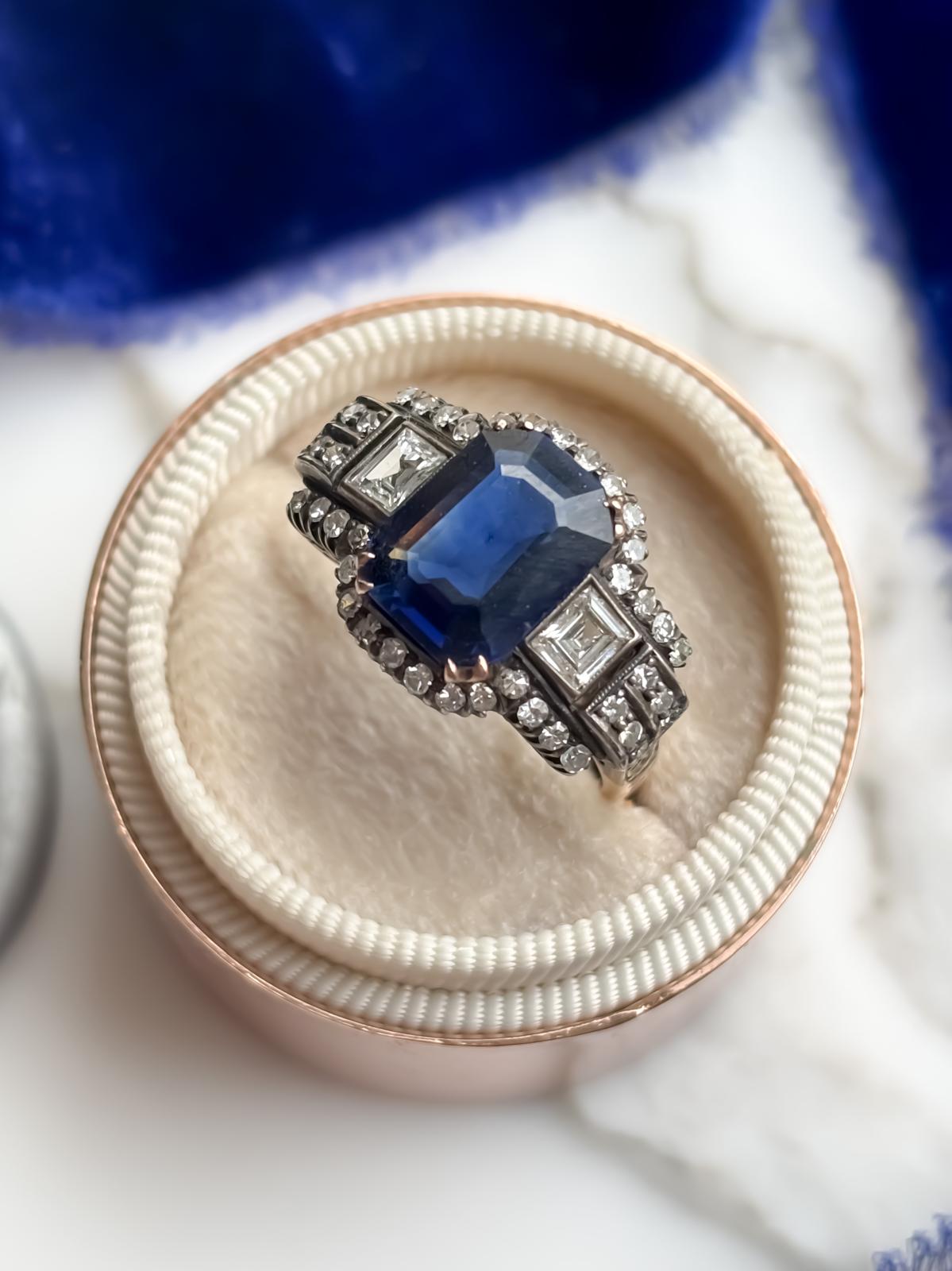 Description: An Art Deco 14k tested sapphire and diamond ring, with a maker’s mark indicative of continental workshop production. The approximately 4.15ct step-cut, elongated octagonal lab-created sapphire, consistent with Art Deco production, is accented with 0.40cttw step-cut diamonds and 0.60cttw single-cut diamonds.