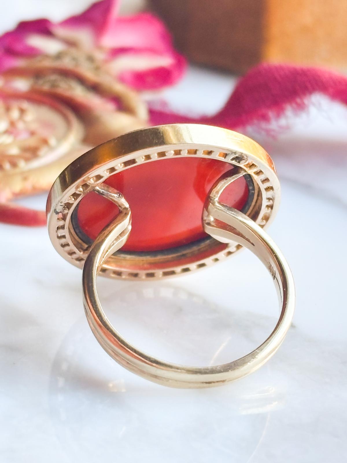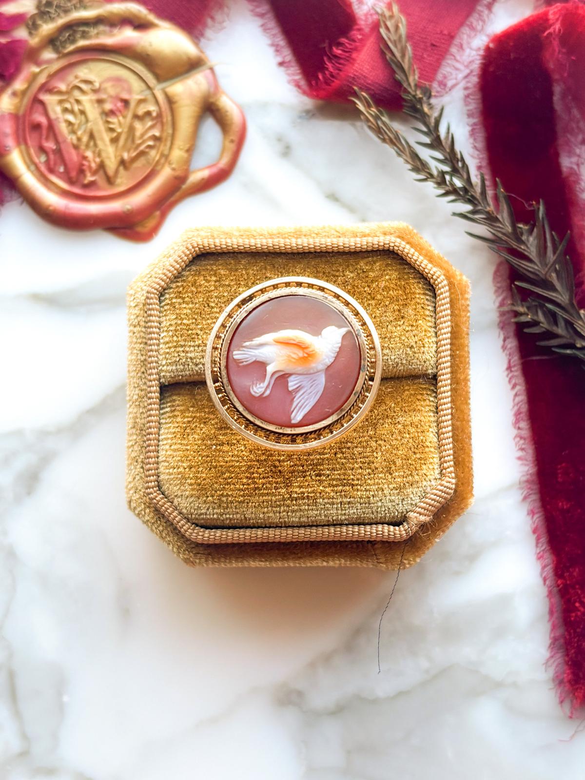 Description: An antique Victorian c1880–1910 14k tested carved carnelian cameo in warm yellow gold. The cameo depicts a dove, frequently used during the Victorian era to represent peace and spirit. This piece features a pierced gallery border and original split-shoulder mount, most likely custom for the cameo.