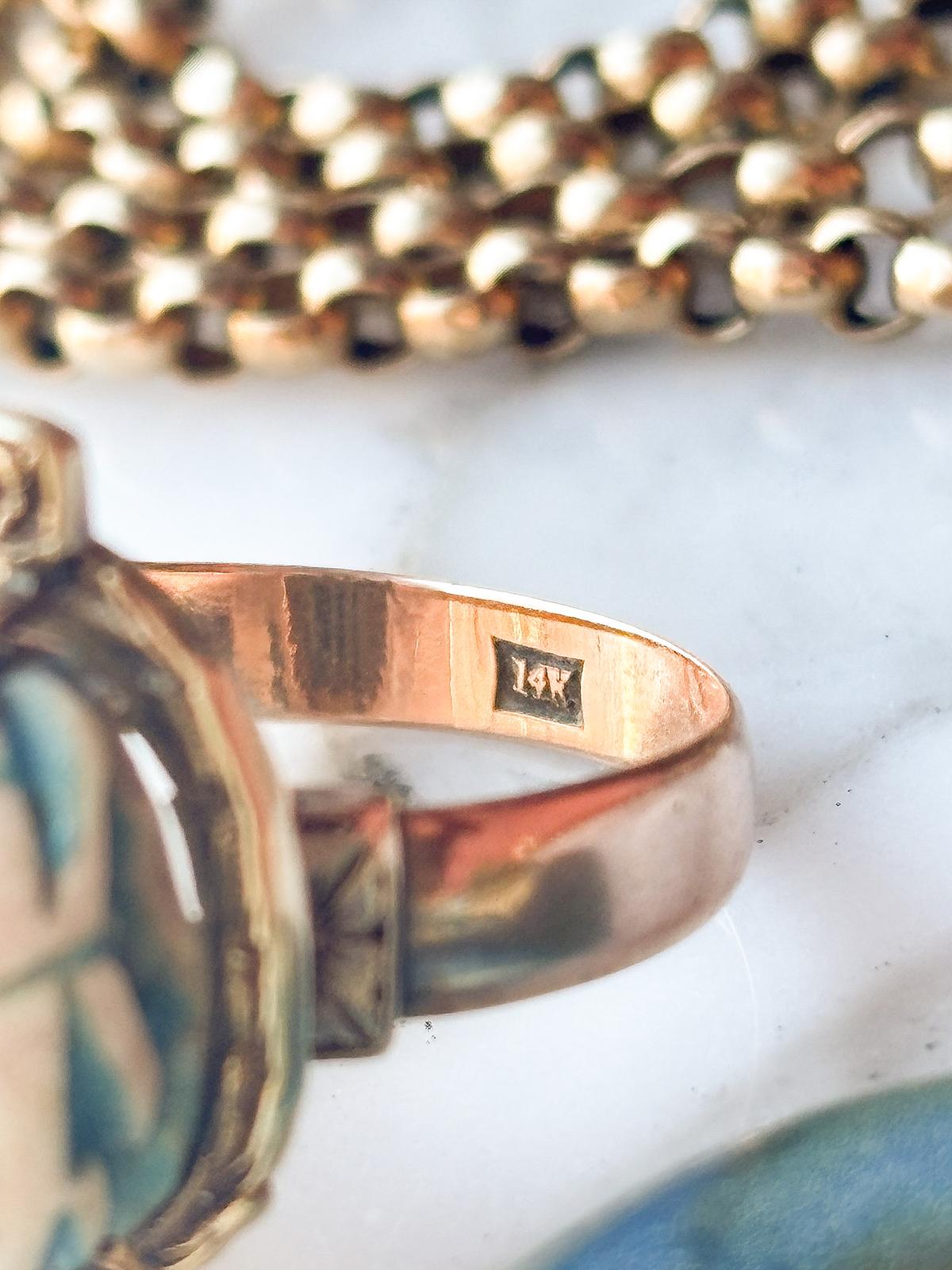Description: An antique Victorian c1900–1910 14k stamped Egyptian faience scarab in rose gold. Accented with a ruby, this faience is glazed ceramic, originally produced in ancient Egypt around 1000 BCE.