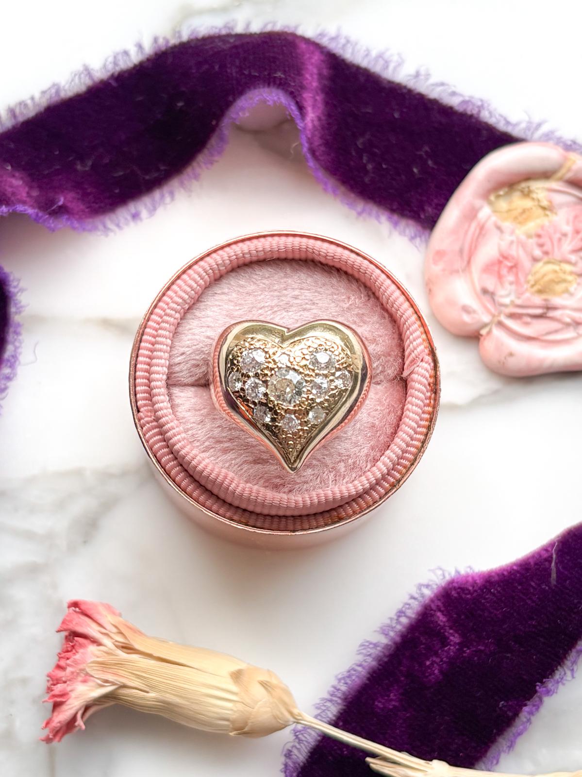 Description: A vintage 14k tested 0.72cttw, pavé set Old Mine Cut Diamond Puffy Heart Ring.