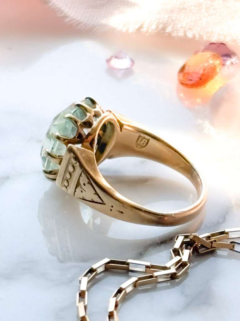 Description:  An antique Victorian 18ct stamped ~6ct cushion cut aquamarine in yellow gold.  She is a natural aquamarine with hints of blue and green.  There is one possible retip, but she is absolutely secure.