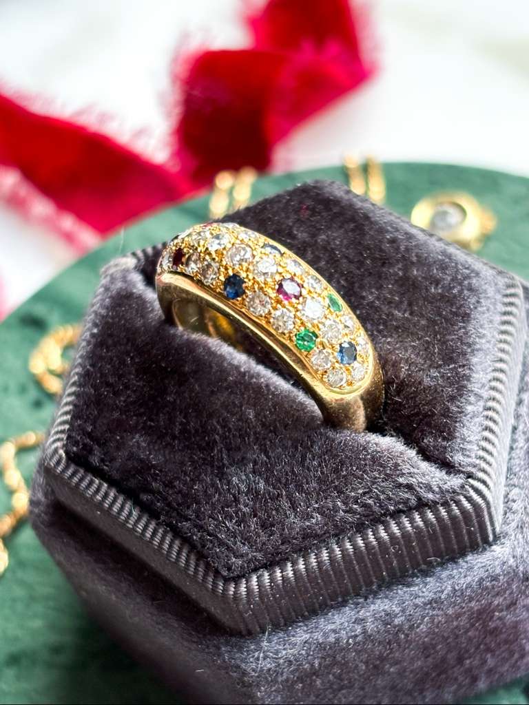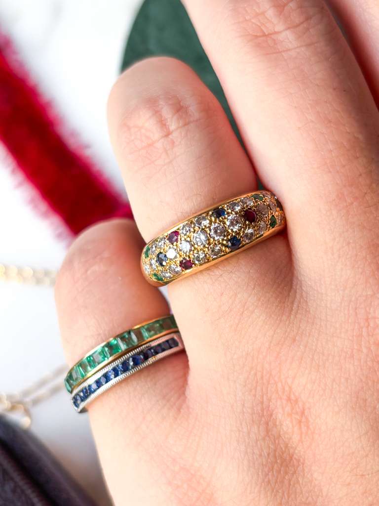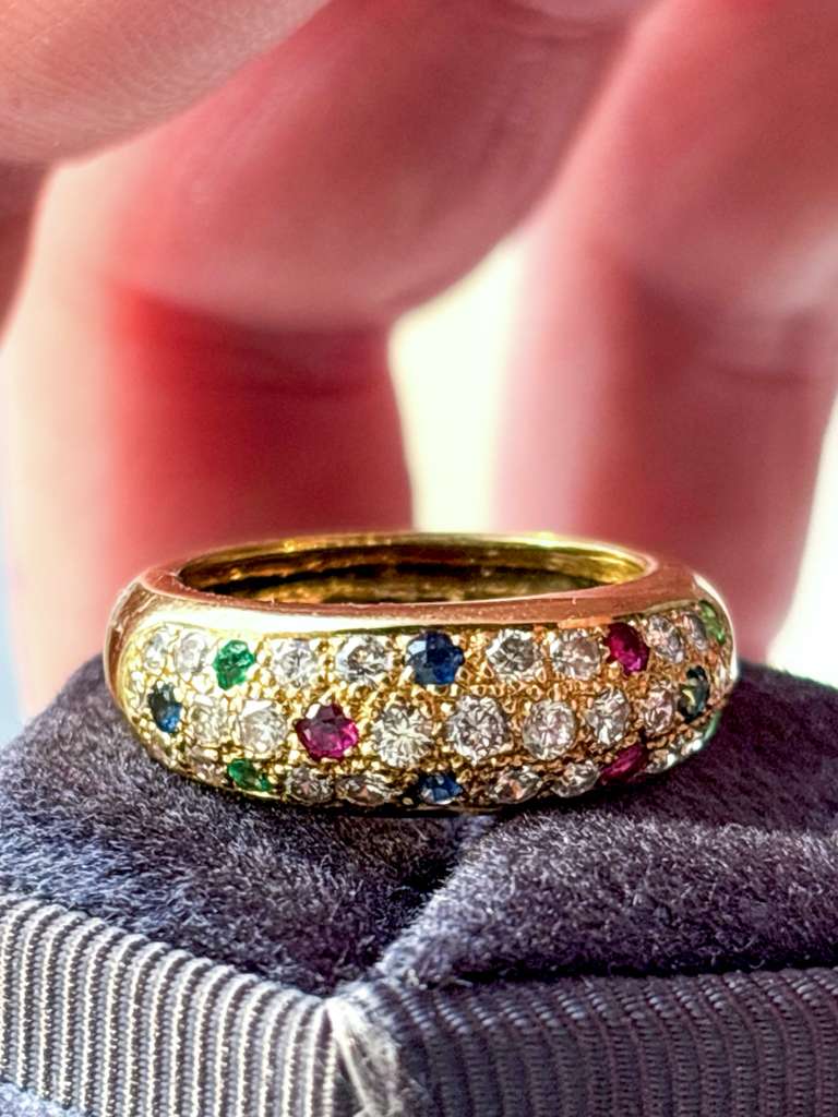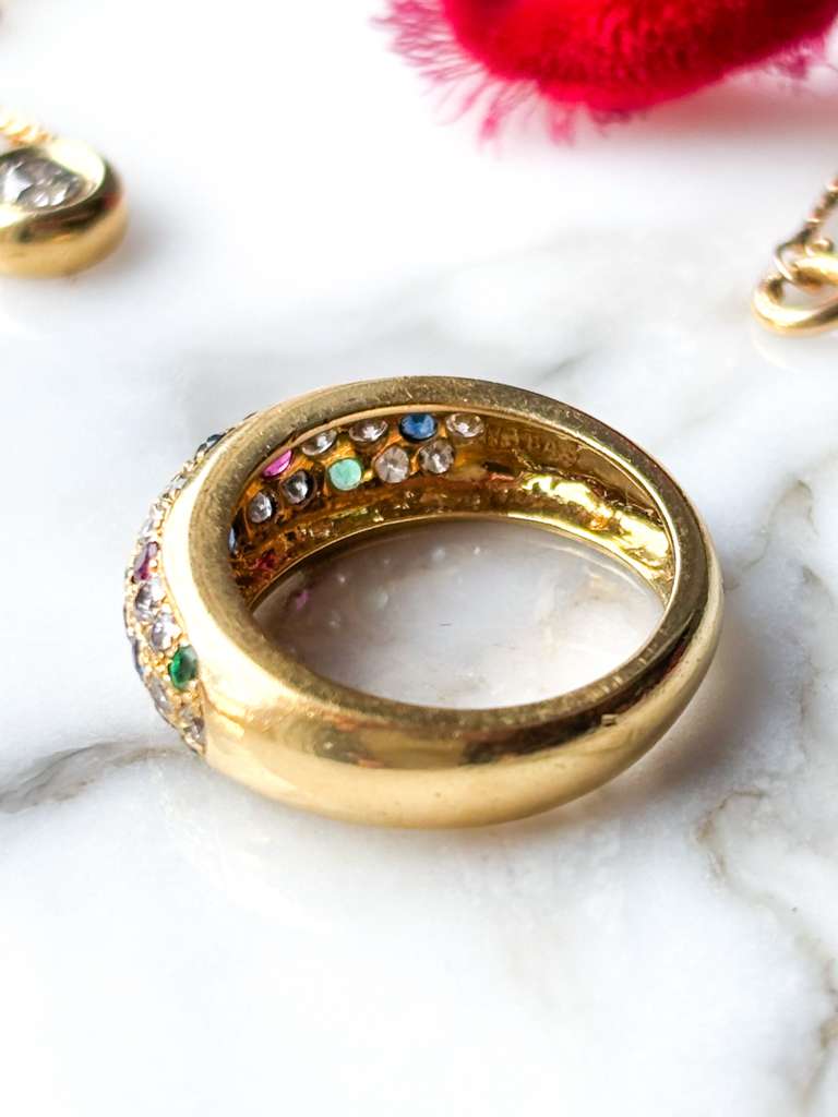 Description: A vintage 18k stamped 0.68cttw diamond and multi-gemstone round dome or donut ring. This chubby baby is pave set with diamonds, sapphires, emeralds, and rubies.