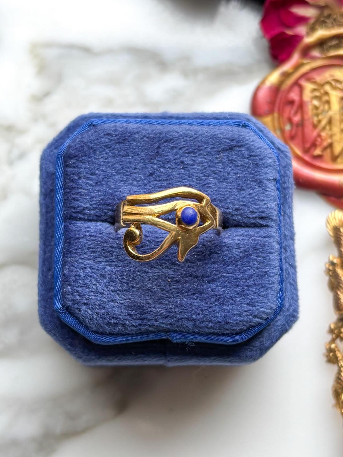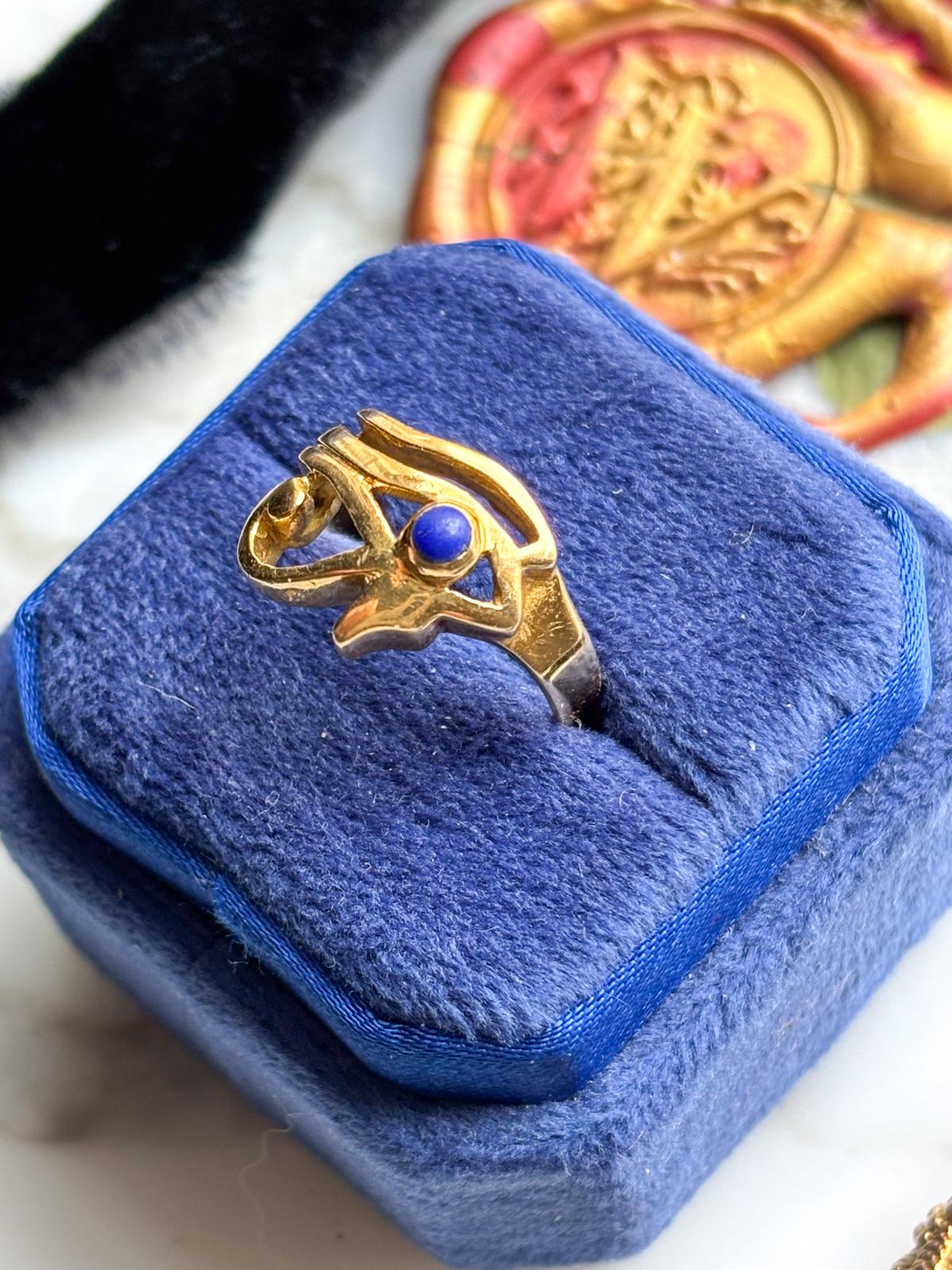 Description: A vintage 18k stamped Egyptian lapis ring in yellow gold.