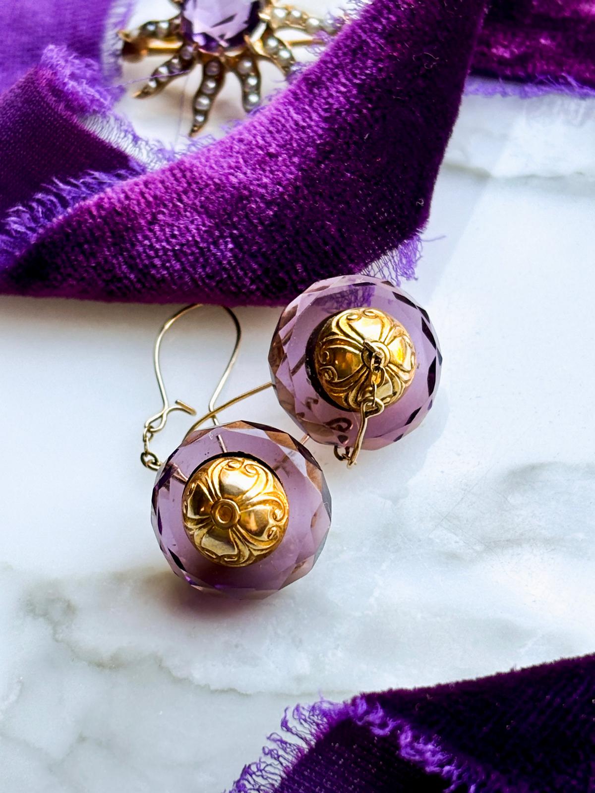 Description: A pair of antique late Victorian 14k XRF tested faceted amethyst drop earrings with detailed repoussé gold orbs in warm yellow gold. Suspended on 14k XRF tested fish-hook wires with undeciphered hallmarks.