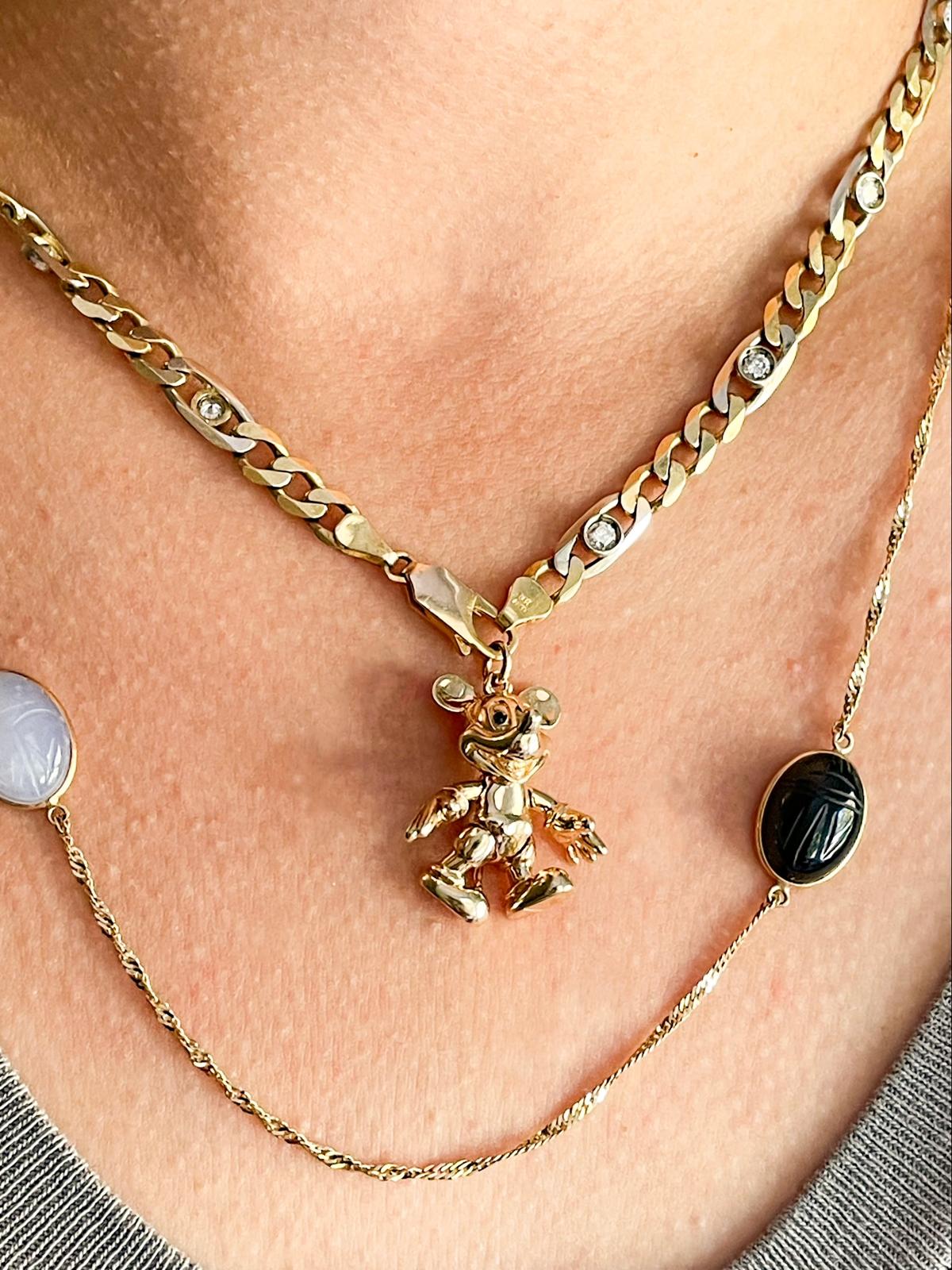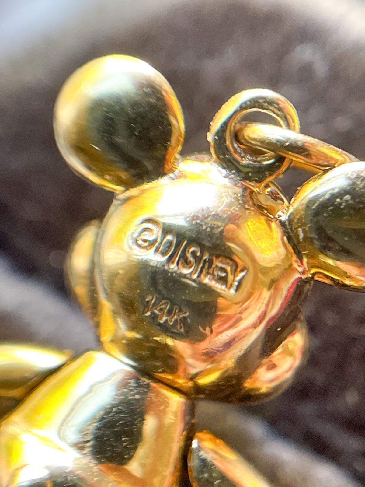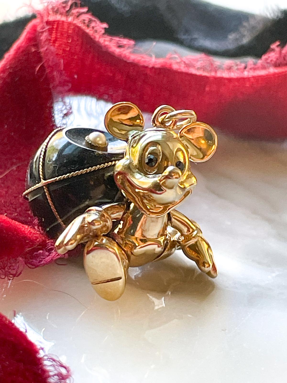 Description: A vintage 14k stamped fully articulated official Disney Mickey Mouse in yellow gold. Even his little tail spins, and that is some sort of crafting genius right there!