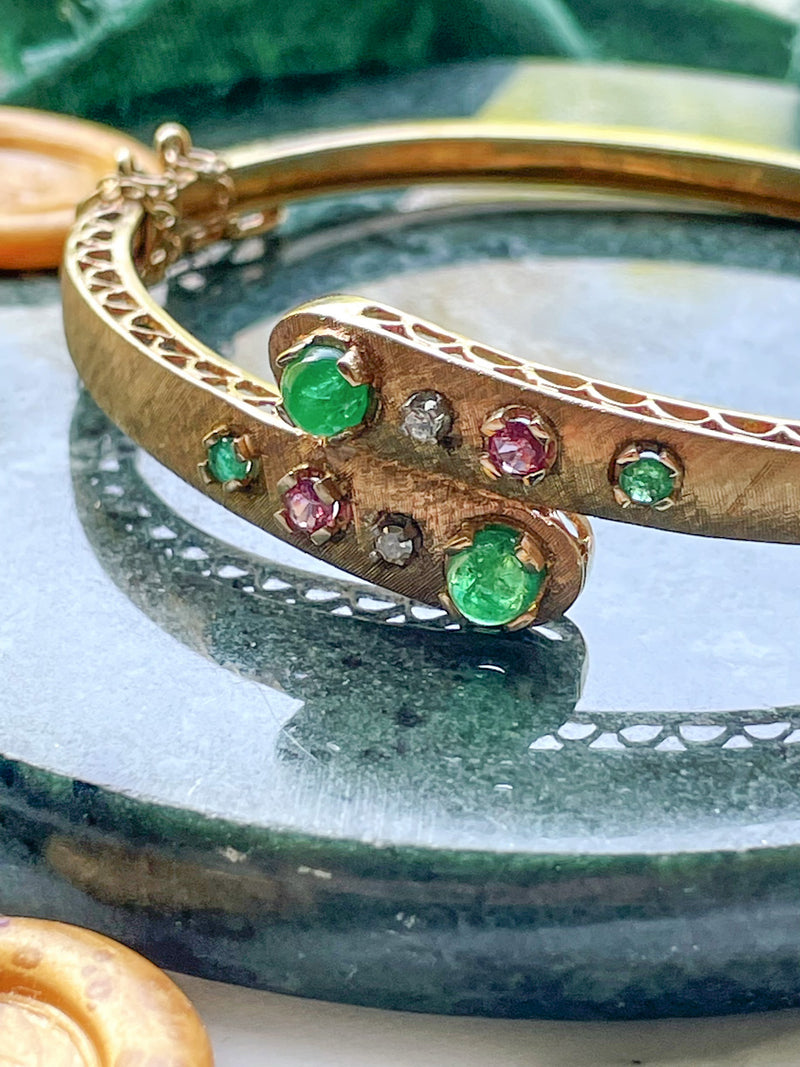 14k Vintage Emerald, Ruby, & Diamond Bangle