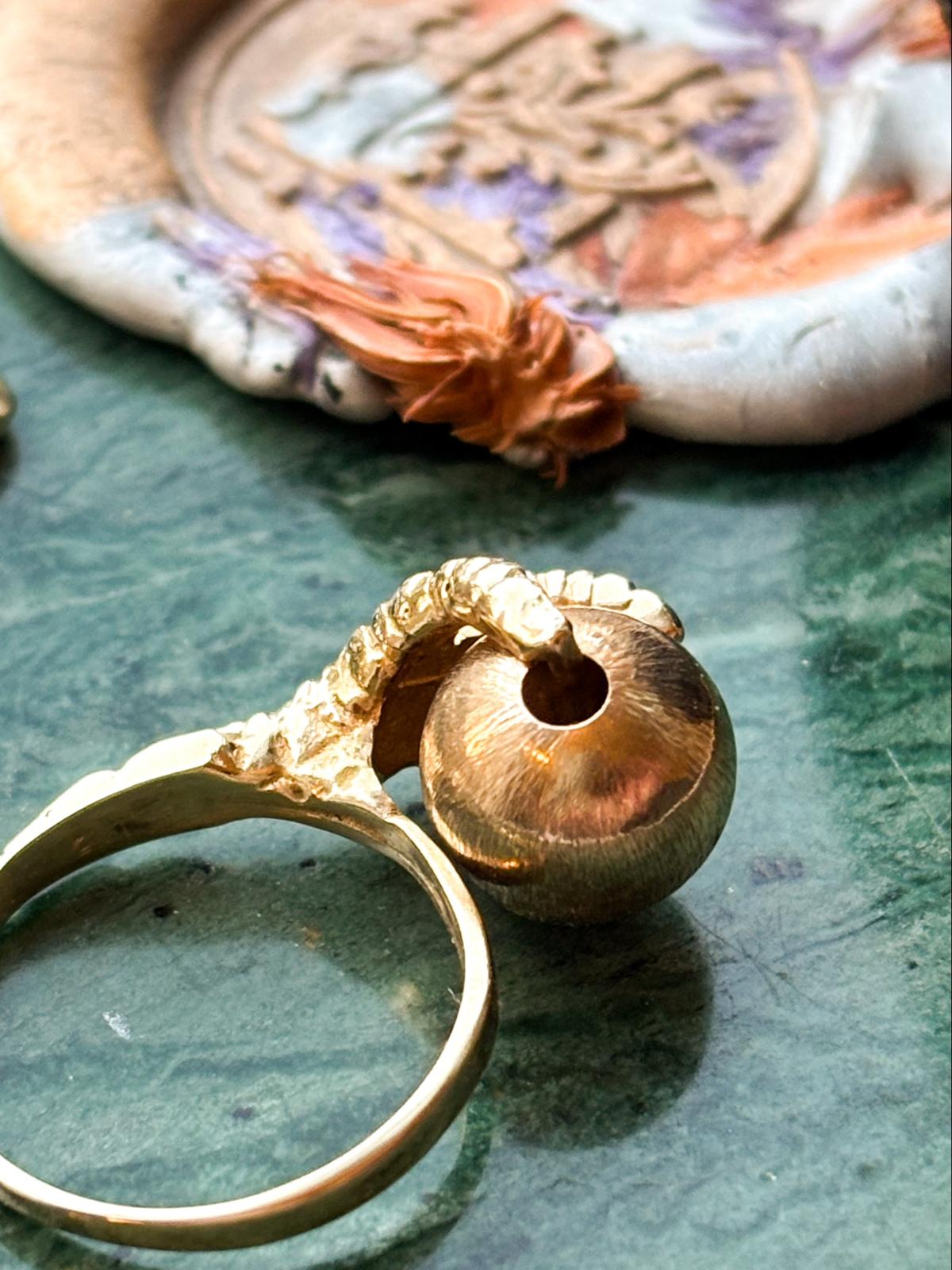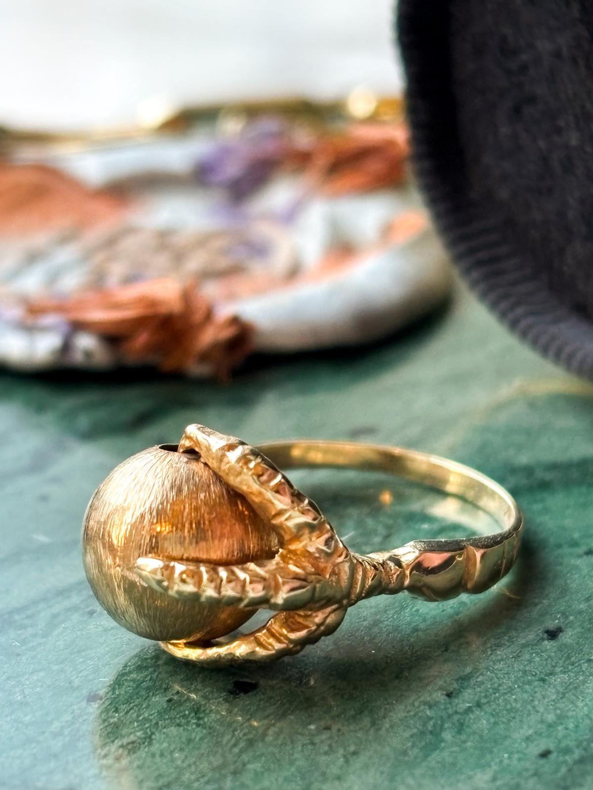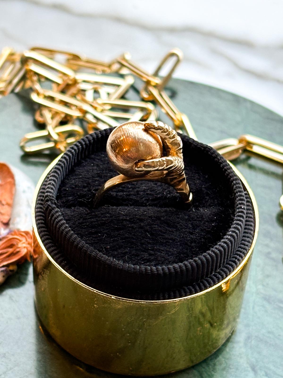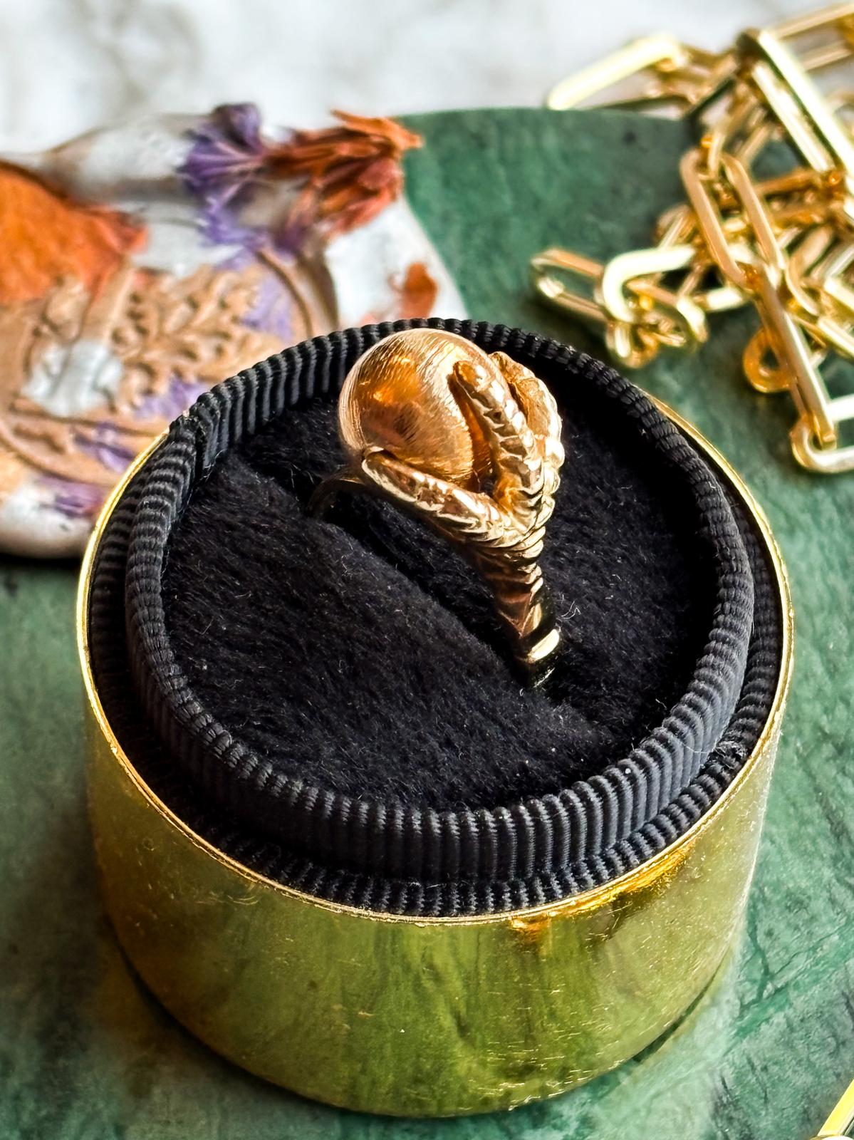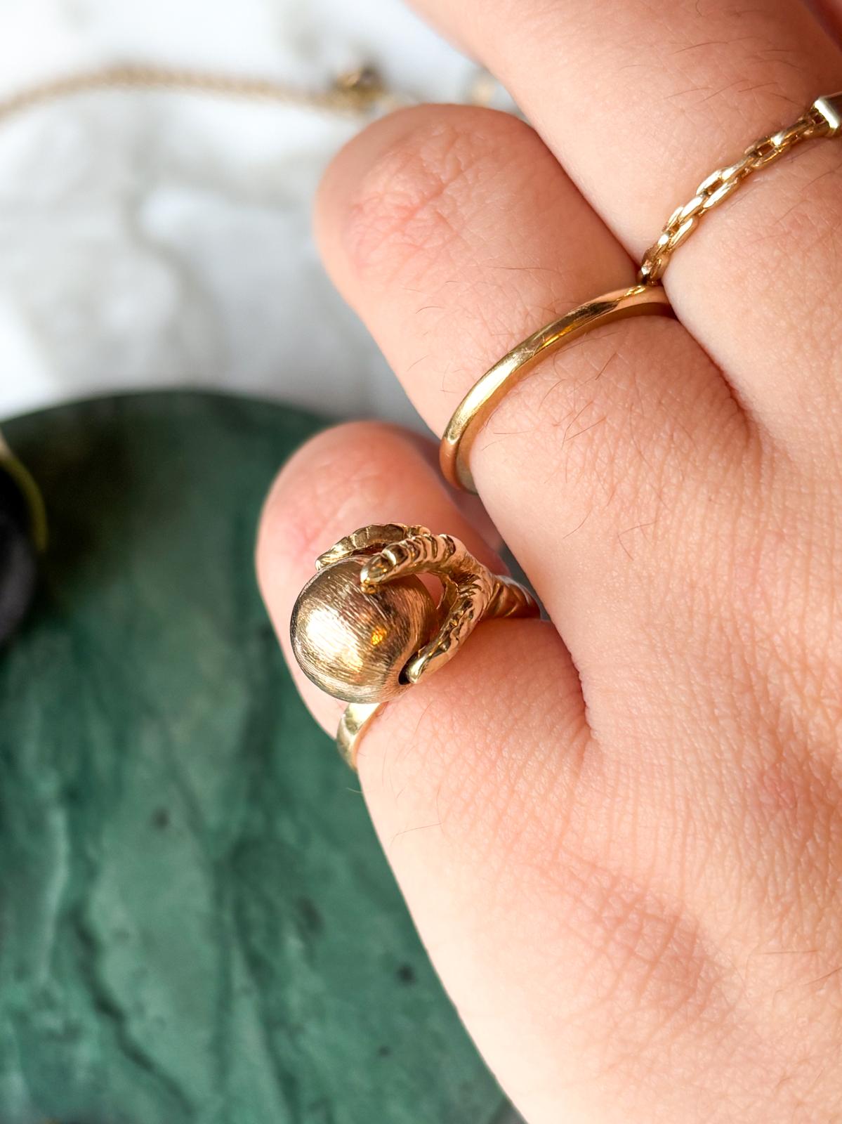 Description: A vintage 14k talon ring in yellow gold. The talon clutches a gold orb and slightly articulated.