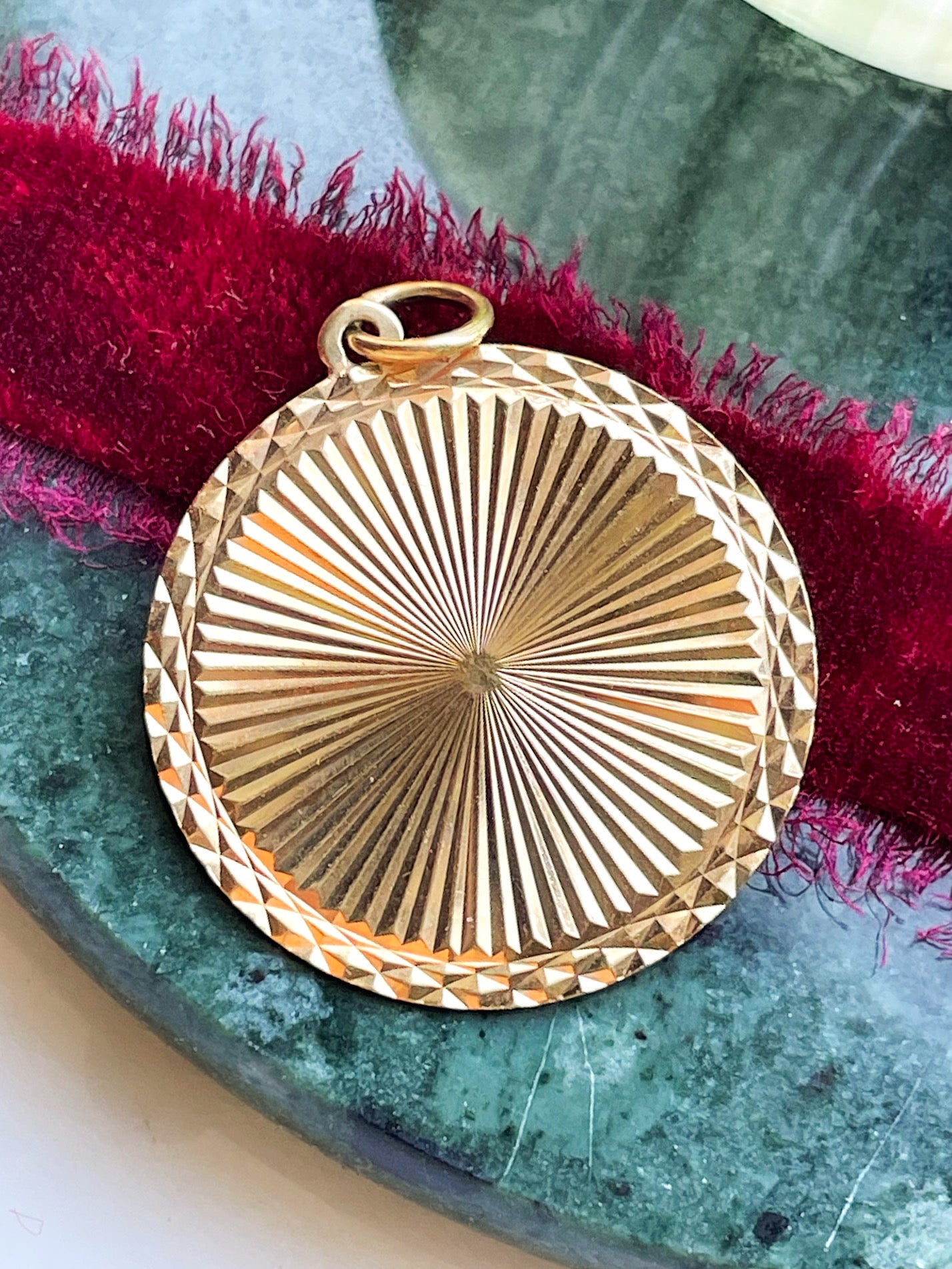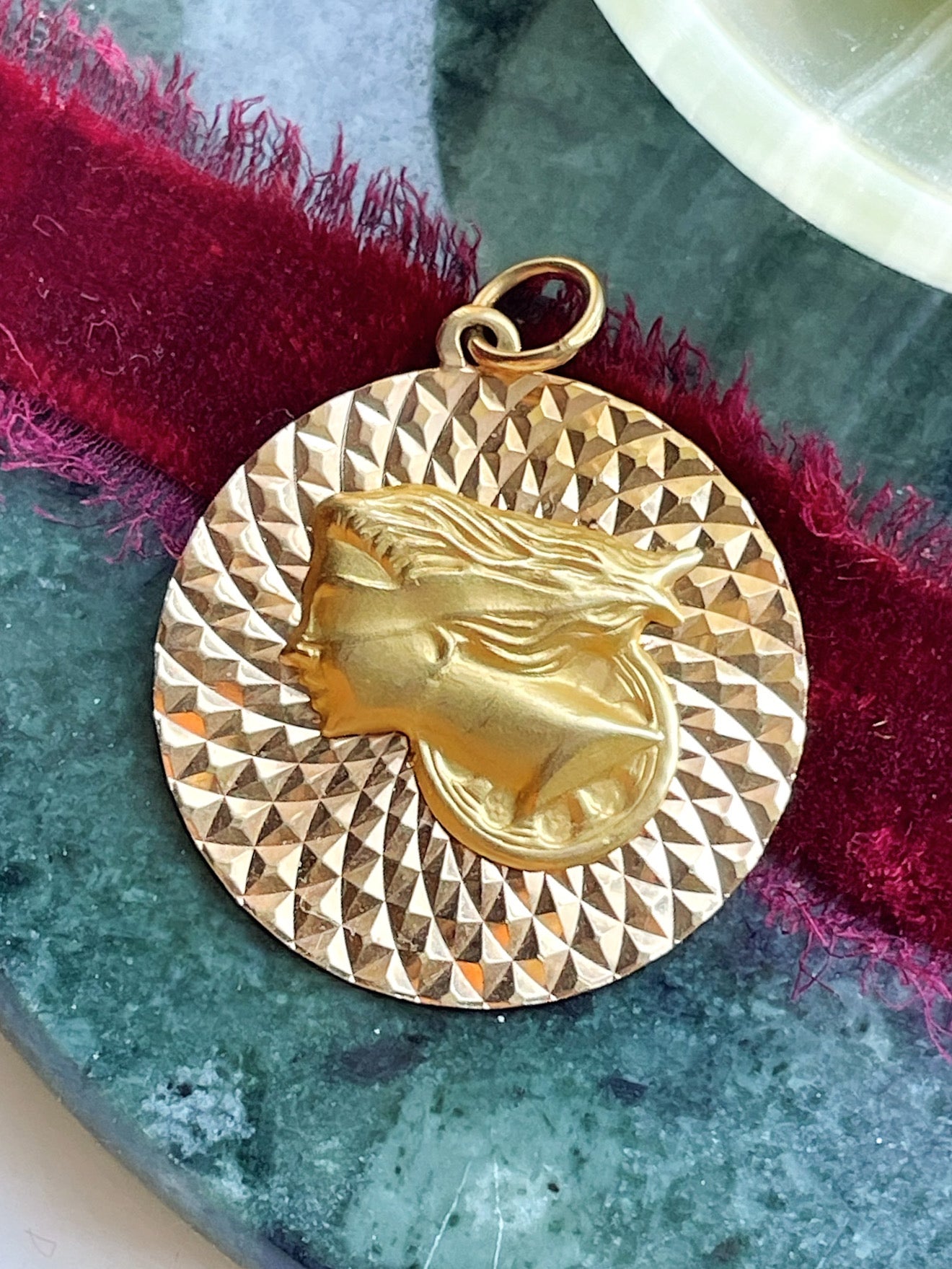Description: A vintage 18k tested Lady Justice medallion in yellow gold.